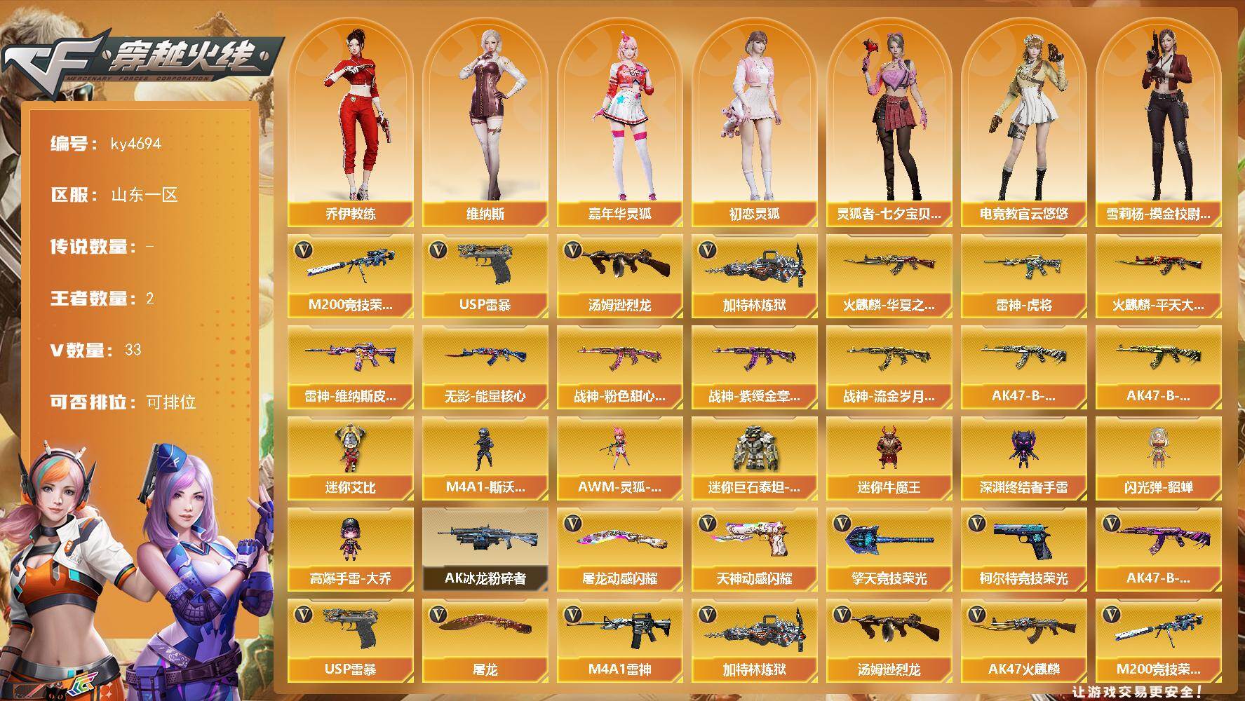 【573224】【573224】[17771050]【ky4694】山东一区-33V-2王者-0炫金【热门武器】:M200-竞技荣光,汤姆逊-烈龙*2,加特林