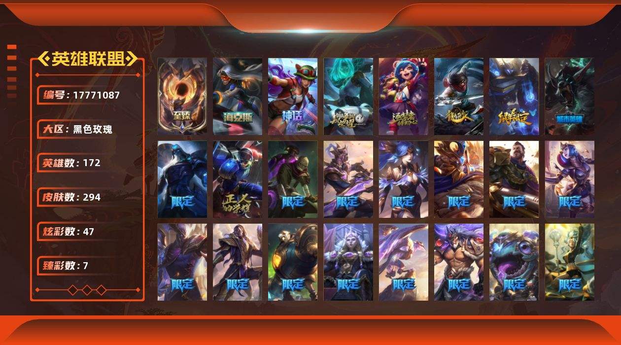 【573253】[17771087]未定级段位-172英雄-294皮肤-47炫彩-0终极-5神话-30限定-27传说-74史诗【神话皮肤】:十周年纪念安妮,源代码乐芙兰,十五周年纪念希维尔,新创战纪希维尔,至臻暗星墨菲特【热门头像】:爱情之歌头像【至臻皮肤】:至臻暗星墨菲特【臻彩皮肤】:无畏骑士瑟庄妮赤子初心,冰雪节格雷福斯炫金,霸天异形卡兹克掠空魅影,弹幕天使卡莎炽天使勇敢,可爱可爱粉红红布里