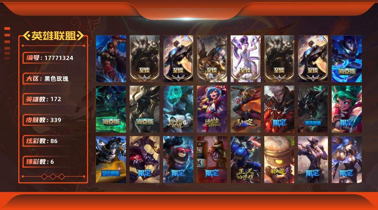 【573297】[17771324]未定级段位-172英雄-339皮肤-86炫彩-1终极-12神话-40限定-23传说-75史诗【神话皮肤】:十周年纪念安妮,源代码乐芙兰,神凰行者瑞羽圣凰艾尼维亚,海克斯科技嘉文四世,零之枪骑赫卡里姆,摄魂使者薇恩,至臻KDAALLOUT卡莎,至臻神龙尊者炎龙瑟提,至臻未来战士锤石,至臻未来战士锤石2022,至臻腥红之月亚托克斯,至臻腥红之月亚托克斯2022【热