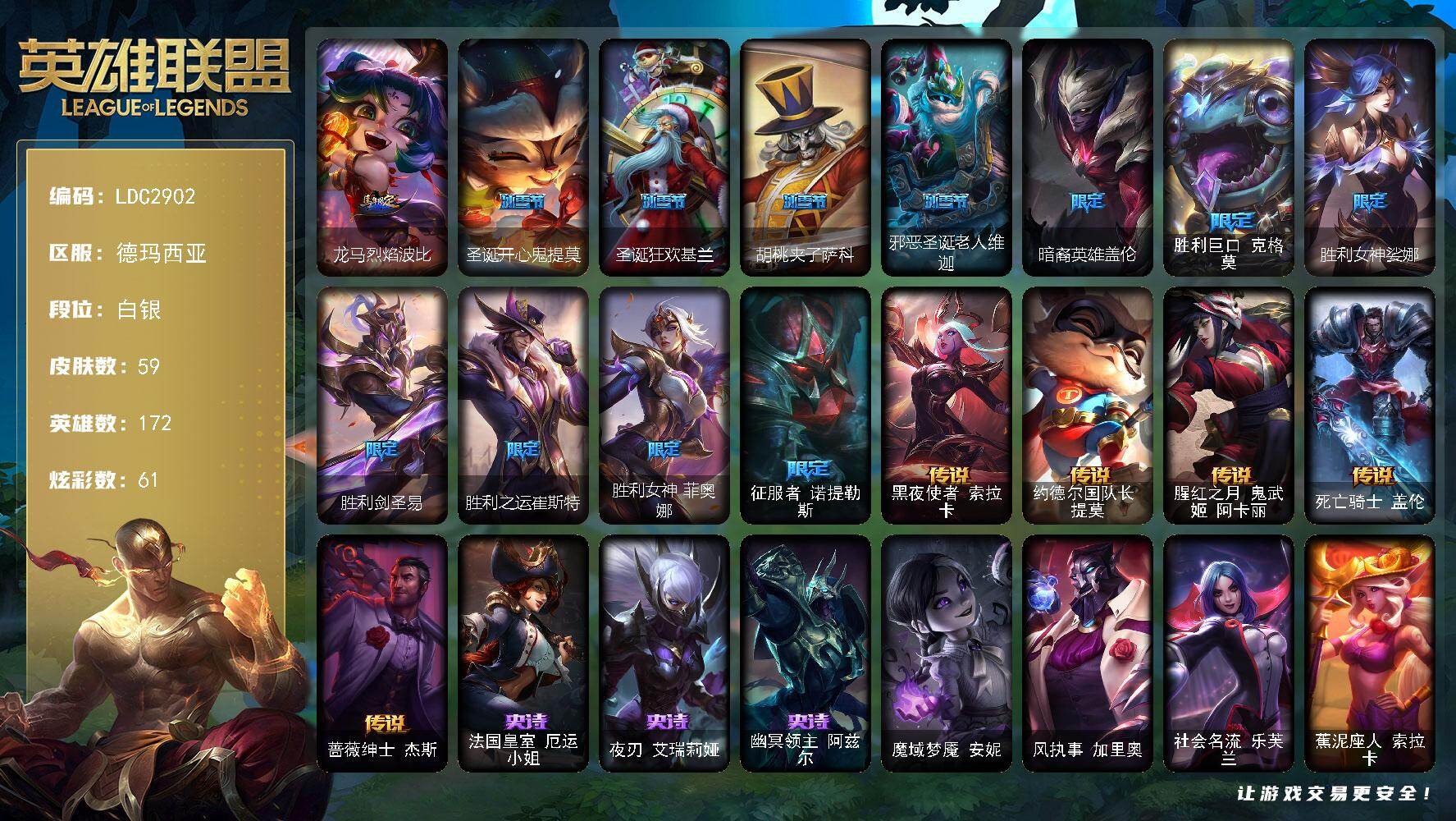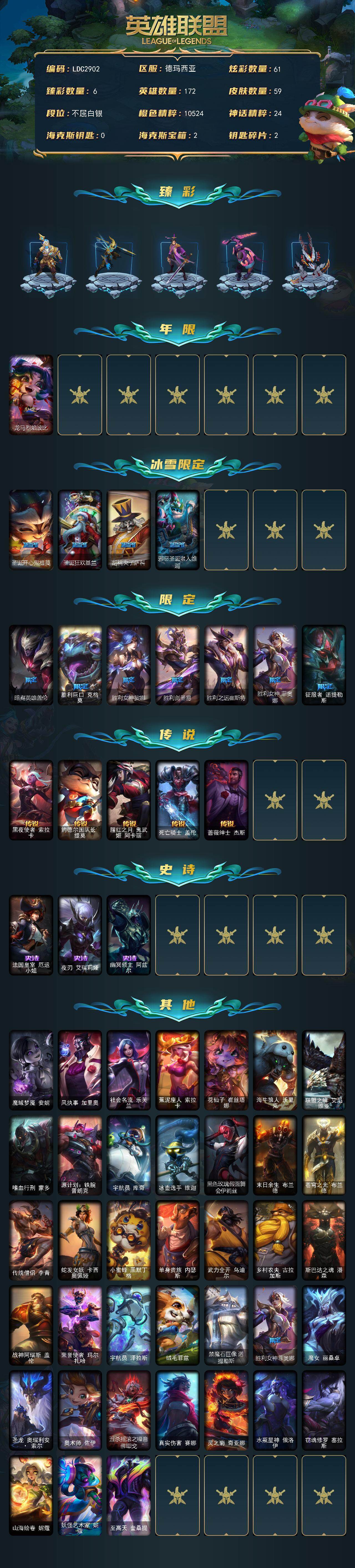 【574350】【LDC2902】172英雄/59皮肤/13限定/6臻彩/61炫彩/5传说/3史诗/白银/冠军之志瑞兹凯旋圣装/冠军之矛卡莉丝塔凯旋圣装/玉剑传说无极麒麟/源计划毁灭派克幻灭/霸天异形卡兹克刹那银光/战斗学院盖伦不死鸟/龙马烈焰波比/圣诞开心鬼提莫/圣诞狂欢基兰/胡桃夹子萨科/邪恶圣诞老人维迦/暗裔英雄盖伦/胜利巨口克格莫/胜利女神娑娜/胜利剑圣易/胜利之运崔斯特/胜利女神菲奥娜