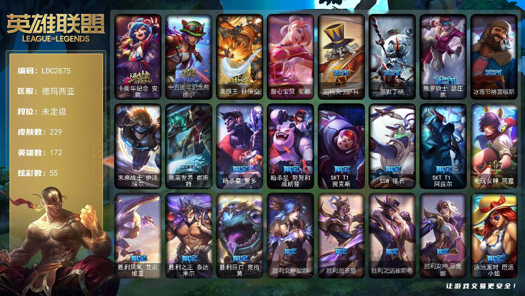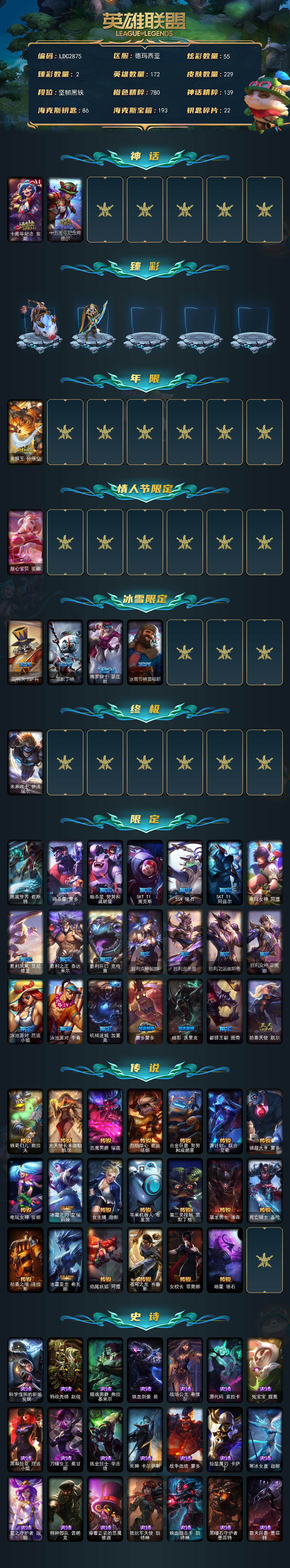 【574385】【LDC2875】172英雄/229皮肤/1终极/2神话/28限定/2臻彩/55炫彩/20传说/63史诗/未定级/十周年纪念安妮/十五周年纪念希维尔/无畏骑士瑟庄妮赤子初心/冠军之箭艾希凯旋圣装/美猴王孙悟空/甜心宝贝娑娜/胡桃夹子萨科/雪默丁格/魄罗骑士瑟庄妮/冰雪节格雷福斯/未来战士伊泽瑞尔/地底世界崔斯特/暗杀星蒙多/暗杀星努努和威朗普/SKTT1贾克斯/SSW锤石/SKT