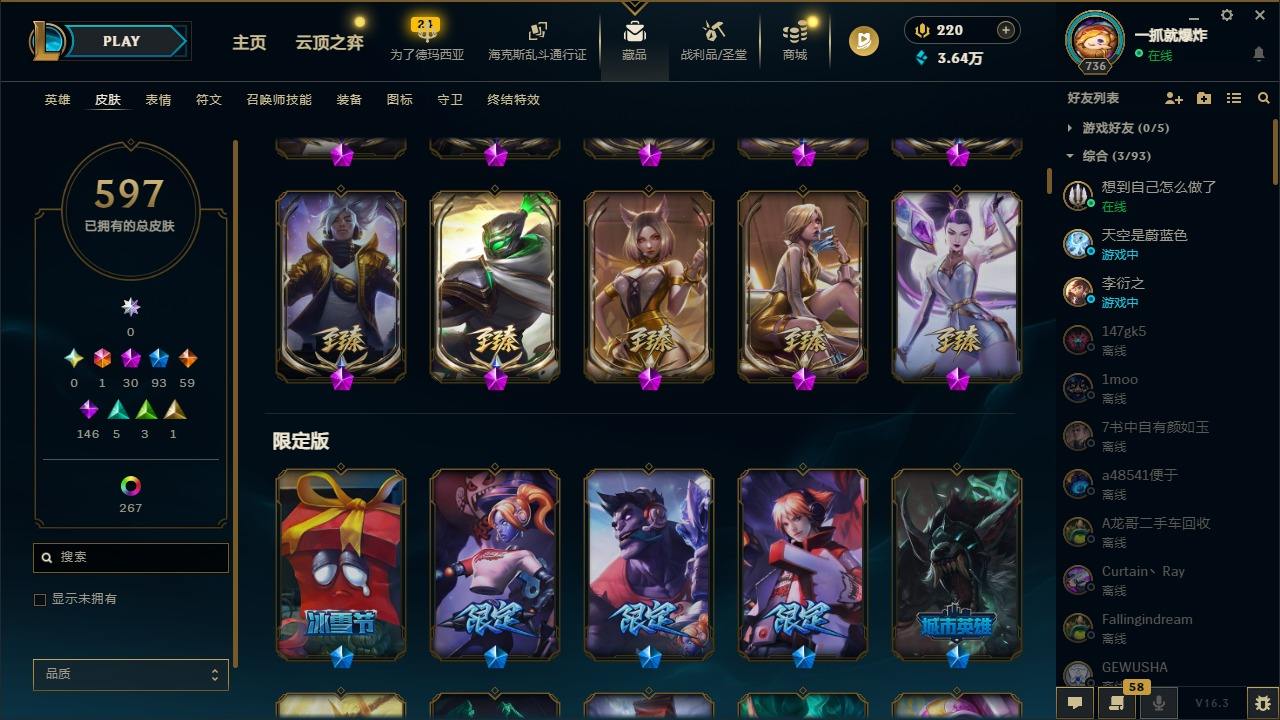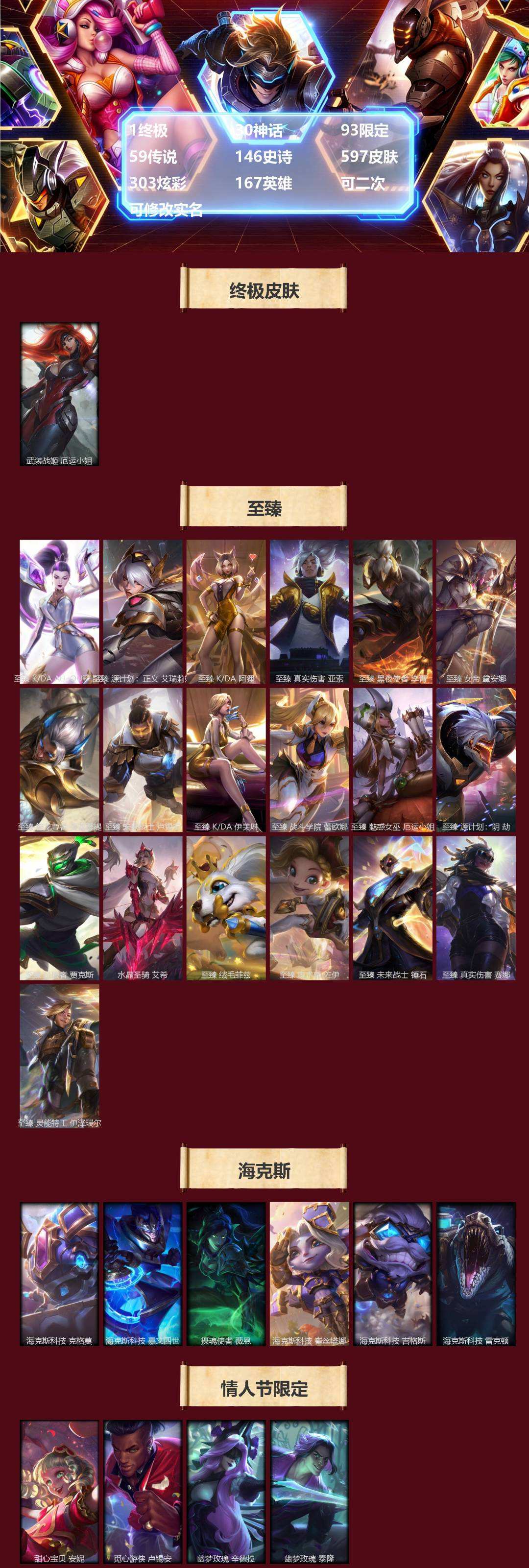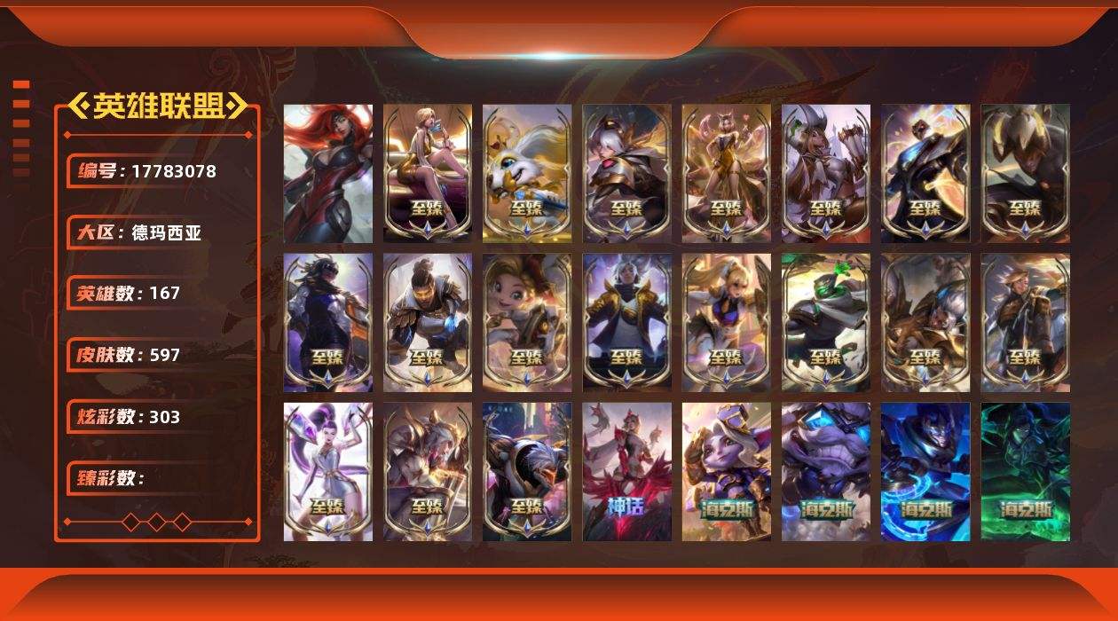 【574926】[17783078]1终极 30神话 93限定 59传说 146史诗 597皮肤 303炫彩 167英雄 可二次 可修改实名 【至臻】至臻 K/DA 伊芙琳,至臻 绒毛菲兹,至臻 源计划:正义 艾瑞莉娅,至臻 K/DA 阿狸,至臻 魅惑女巫 厄运小姐,至臻 未来战士 锤石,至臻 黑夜使者 李青,至臻 真实伤害 赛娜,至臻 未来战士 卢锡安,至臻 奥术师 佐伊,至臻 真实伤害 亚索