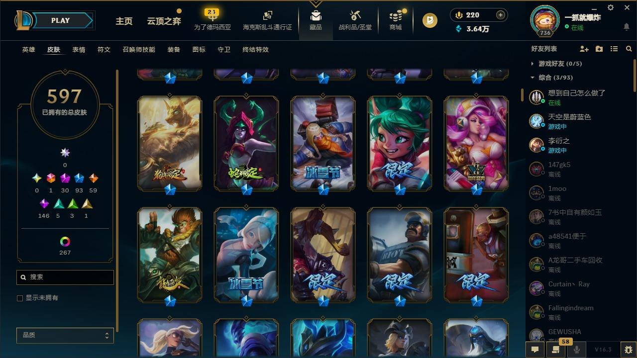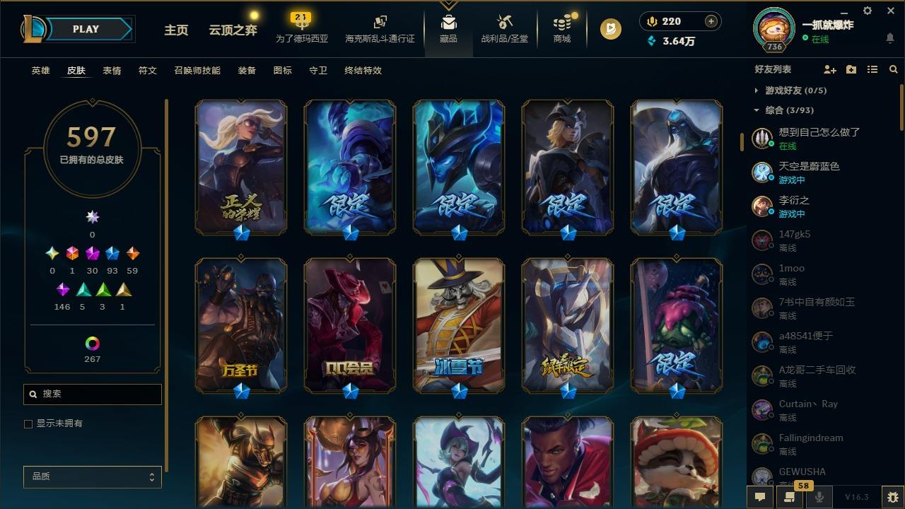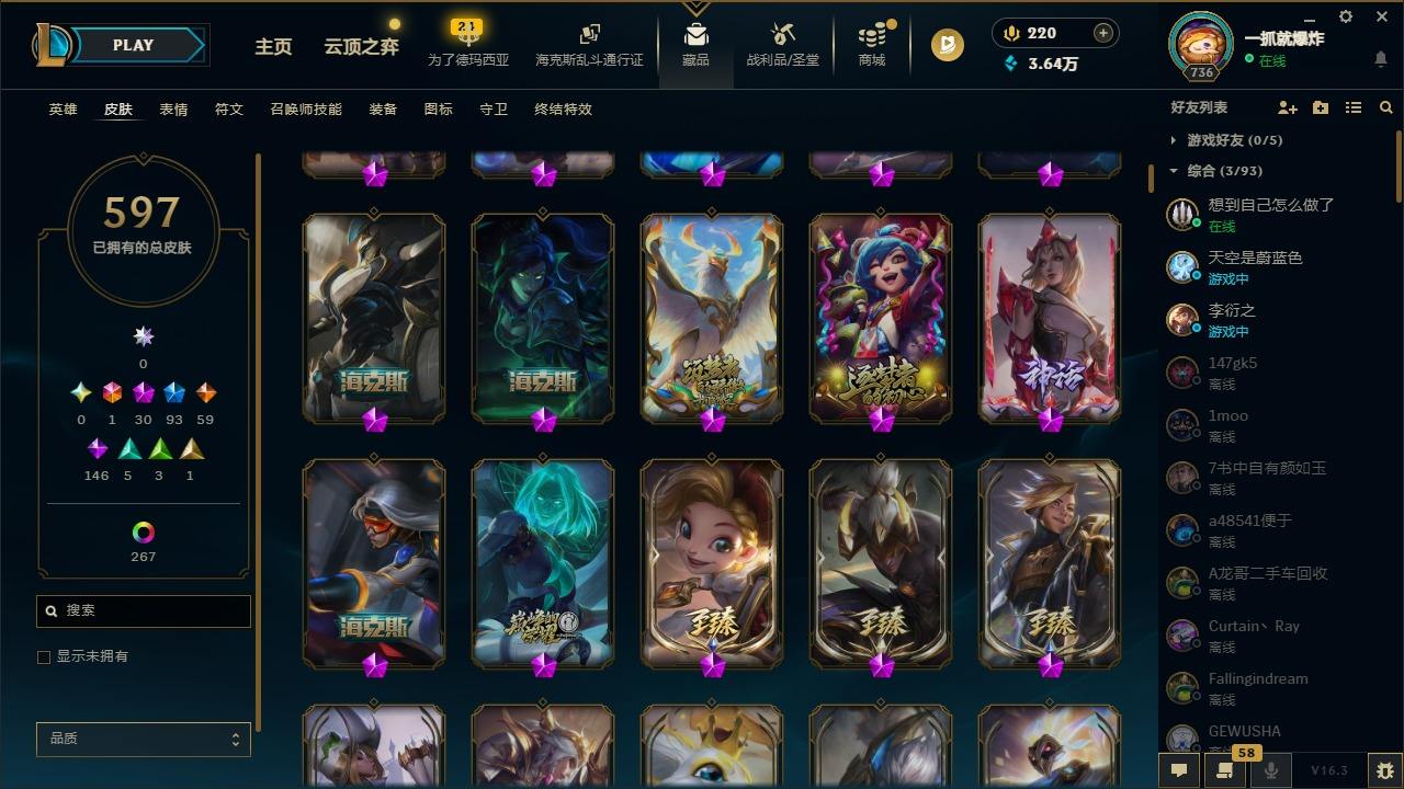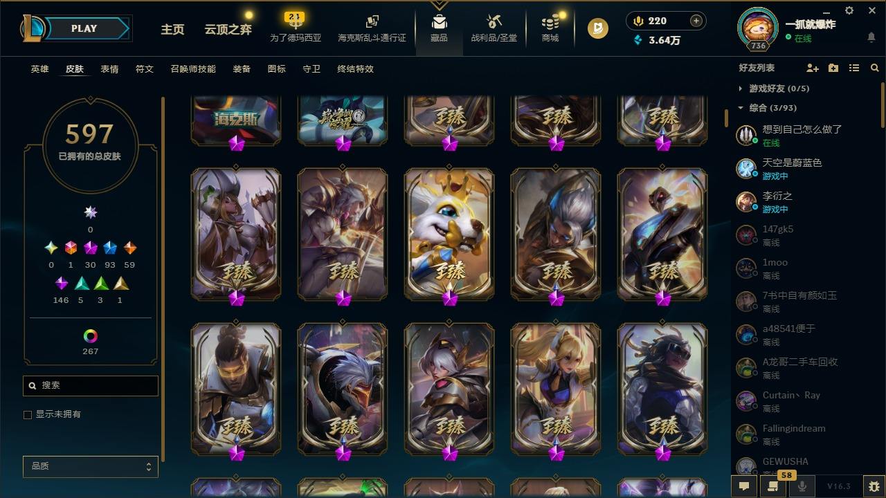 【574926】[17783078]1终极 30神话 93限定 59传说 146史诗 597皮肤 303炫彩 167英雄 可二次 可修改实名 【至臻】至臻 K/DA 伊芙琳,至臻 绒毛菲兹,至臻 源计划:正义 艾瑞莉娅,至臻 K/DA 阿狸,至臻 魅惑女巫 厄运小姐,至臻 未来战士 锤石,至臻 黑夜使者 李青,至臻 真实伤害 赛娜,至臻 未来战士 卢锡安,至臻 奥术师 佐伊,至臻 真实伤害 亚索