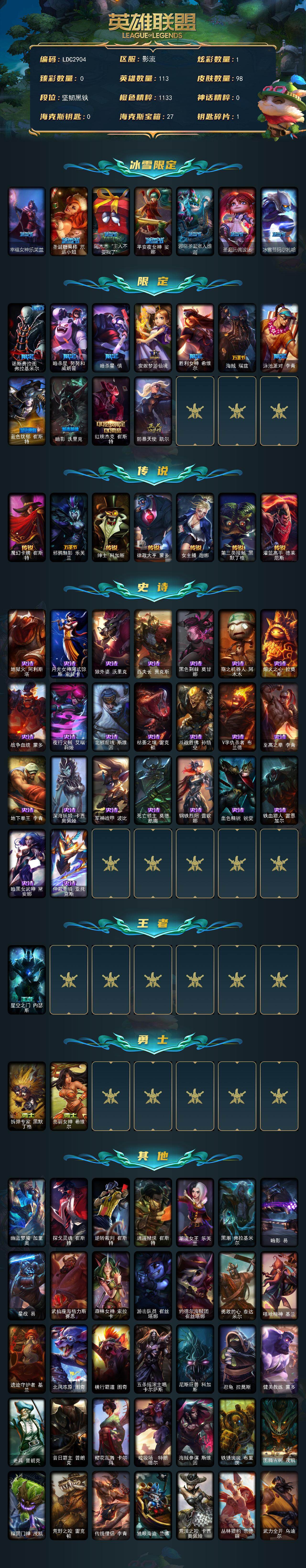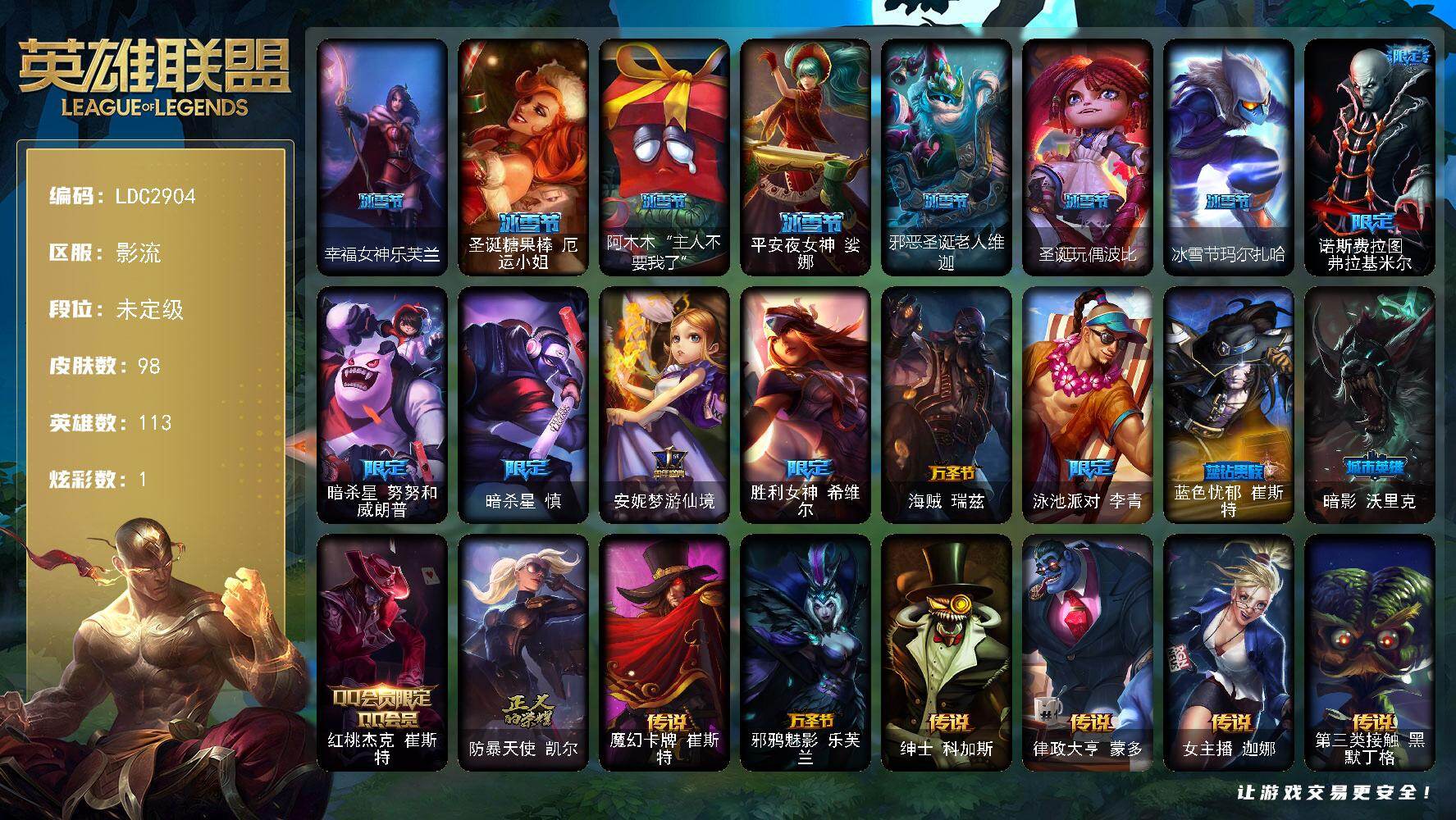 【578576】【LDC2904】113英雄/98皮肤/18限定/1炫彩/7传说/23史诗/未定级/幸福女神乐芙兰/圣诞糖果棒厄运小姐/阿木木:“主人不要我了”/平安夜女神娑娜/邪恶圣诞老人维迦/圣诞玩偶波比/冰雪节玛尔扎哈/诺斯费拉图费拉基米尔/暗杀星努努和威朗普/暗杀星慎/安妮梦游仙境/胜利女神希维尔/海贼瑞兹/泳池派对李青/蓝色忧郁崔斯特/暗影妖狐阿狸/红桃杰克崔斯特/防暴天使凯尔/魔幻卡