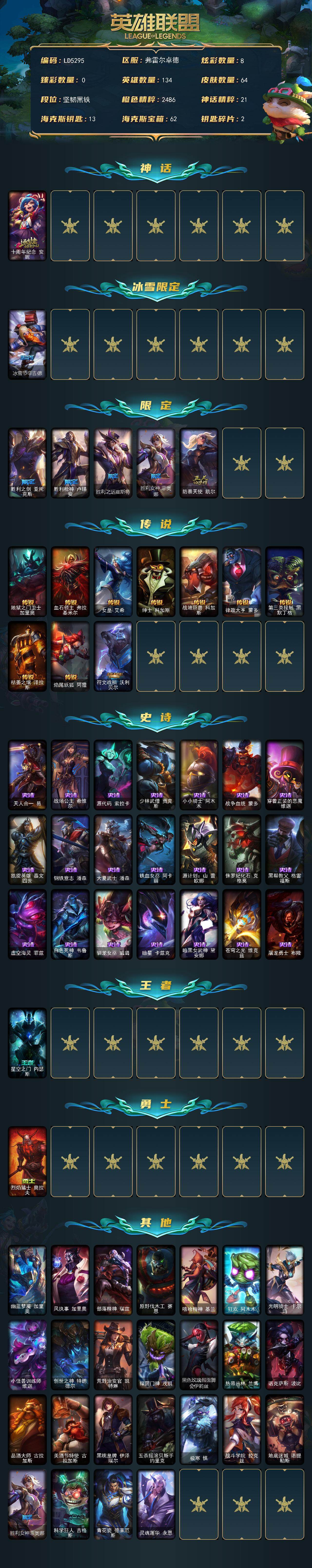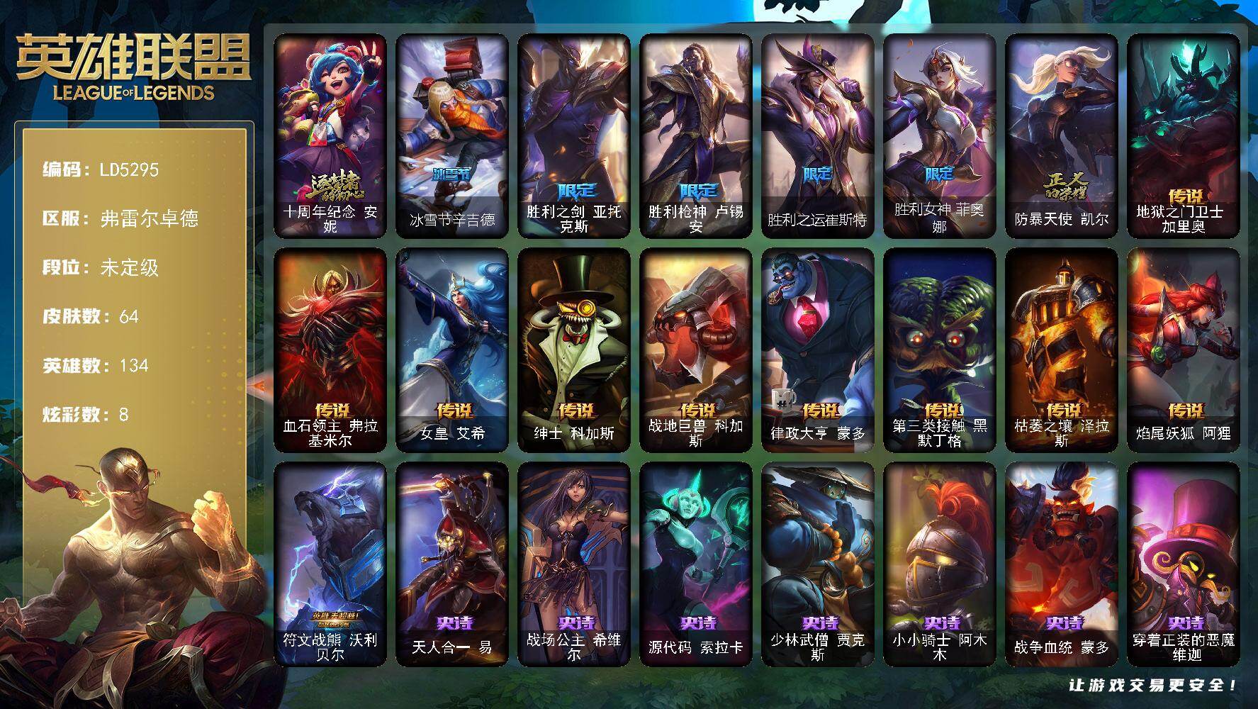 【579977】【LD5295】134英雄/64皮肤/1神话/6限定/8炫彩/10传说/21史诗/未定级账号等级:95/十周年纪念安妮/冰雪节辛吉德/胜利之剑亚托克斯/胜利枪神卢锡安/胜利之运崔斯特/胜利女神菲奥娜/防暴天使凯尔/地狱之门卫士加里奥/血石领主弗拉基米尔/女皇艾希/绅士科加斯/战地巨兽科加斯/律政大亨蒙多/第三类接触黑默丁格/枯萎之壤泽拉斯/焰尾妖狐阿狸/符文战熊沃利贝尔/天人合一