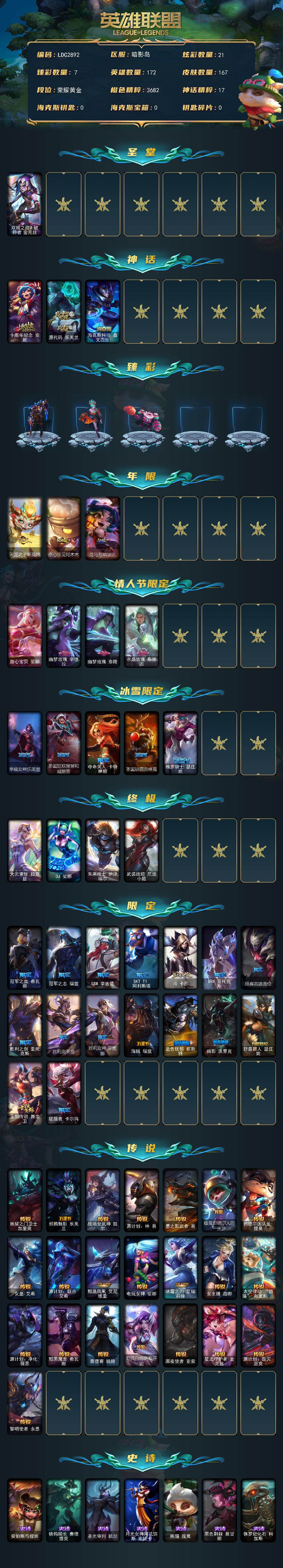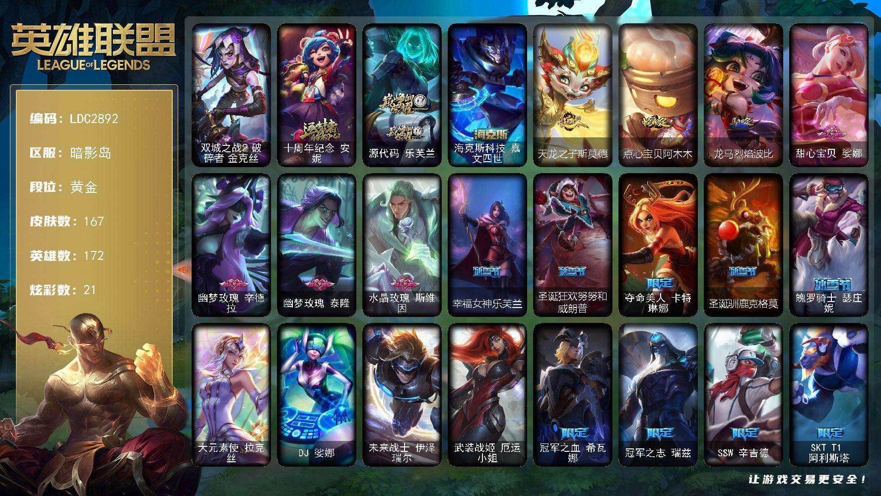 【580811】【LDC2892】172英雄/167皮肤/4终极/3神话/29限定/7臻彩/21炫彩/22传说/28史诗/黄金/双城之战2破碎者金克丝/十周年纪念安妮/源代码乐芙兰/海克斯科技嘉文四世/玉剑传说无劫胭脂/灵魂莲华锐雯流火/可爱可爱粉红红布里茨/魔女阿卡丽虚荣/幽梦玫瑰泰隆浪漫花蕾/人工智能悠米星流电击/天龙之子斯莫德/点心宝贝阿木木/龙马烈焰波比/甜心宝贝娑娜/幽梦玫瑰辛德拉/幽
