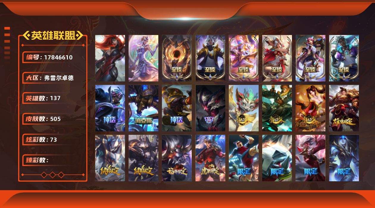 【583974】[17846610]2终极 9神话 78限定 52传说 84史诗 505皮肤 73炫彩 137英雄 可二次 可修改实名 【至臻】至臻 暗星 墨菲特,至臻 真实伤害 亚索,至臻 太空律动 节奏幻师 璐璐,至臻 神凰行者 烈羽焰凰 霞,至臻 幻灵战斗猫 金克丝,至臻 星之守护者 艾克,真实伤害 突破界限 艾克【海克斯】海克斯 阿利斯塔【限定】玉剑传说 舞龙卫,玉剑传说 翼剑仙,钢铁军
