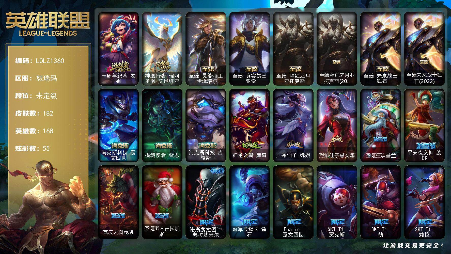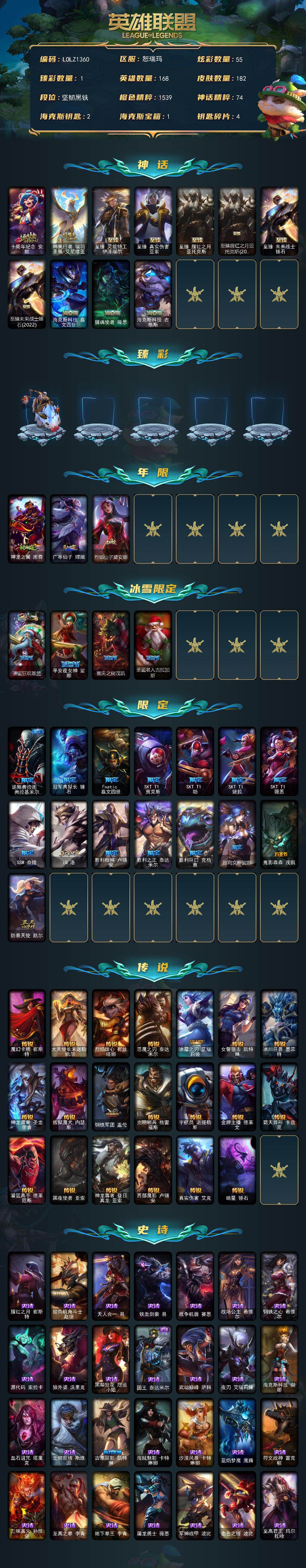 【585667】【LOLZ1360】168英雄/182皮肤/11神话/22限定/1臻彩/55炫彩/20传说/44史诗/未定级/十周年纪念安妮/神凰行者瑞羽凤凰艾尼维亚/至臻灵能特工伊泽瑞尔/至臻真实伤害亚索/至臻腥红之月亚托克斯/至臻腥红之月亚托克斯(2022)/至臻未来战士锤石/至臻未来战士锤石(2022)/海克斯科技嘉文四世/摄魂使者薇恩/海克斯科技吉格斯/无畏骑士瑟庄妮赤子初心/神龙之翼库