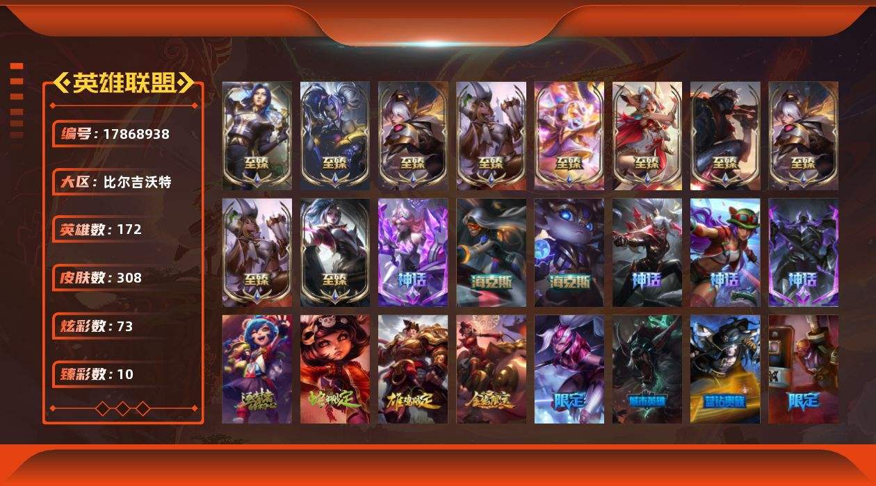 【587260】[17868938]铂金段位-172英雄-308皮肤-73炫彩-0终极-18神话-34限定-31传说-50史诗【热门头像】:爱意绵绵头像,源计划刀妹头像【神话皮肤】:十周年纪念安妮,十五周年纪念希维尔,殿堂传奇薇恩,灰烬骑士莫德凯撒,水晶圣骑蕾欧娜【至臻皮肤】:至臻魅惑女巫厄运小姐,至臻魅惑女巫厄运小姐(2022),至臻源计划正义艾瑞莉娅,至臻源计划:正义艾瑞莉娅(2022),至
