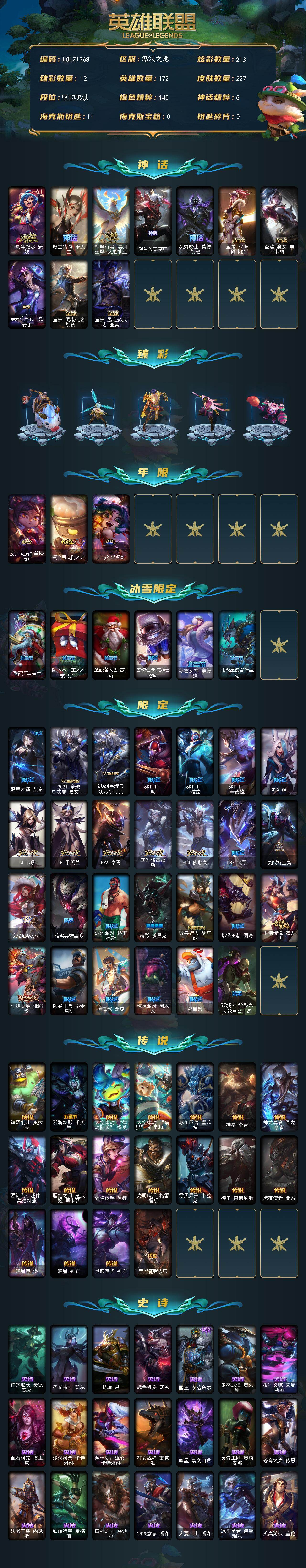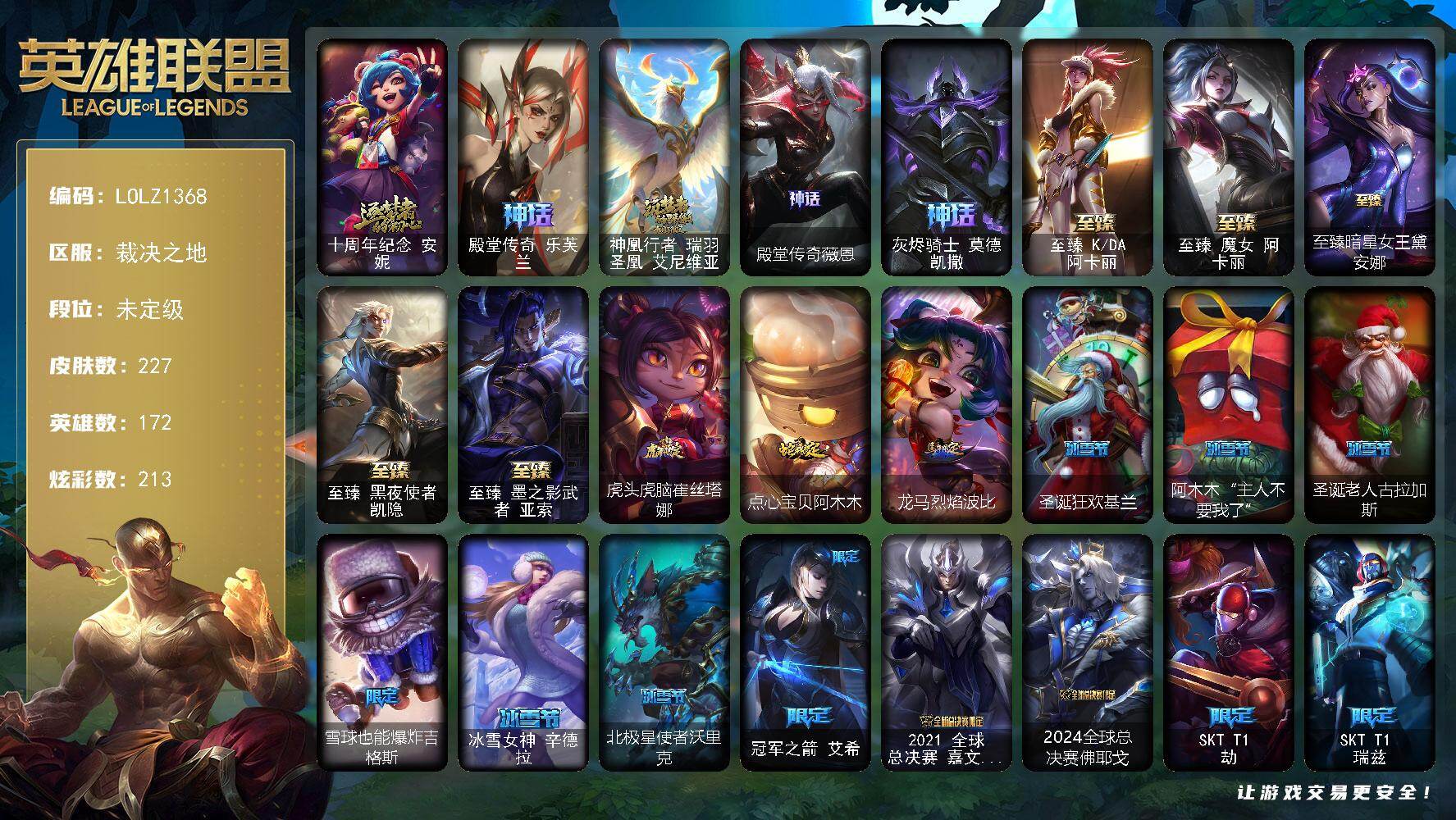 【591310】【LOLZ1368】172英雄/227皮肤/10神话/36限定/12臻彩/213炫彩/18传说/30史诗/未定级/十周年纪念安妮/殿堂传奇乐芙兰/神凰行者瑞羽凤凰艾尼维亚/殿堂传奇薇恩/灰烬骑士莫德凯撒/至臻K/DA阿卡丽/至臻魔女阿卡丽/至臻暗星女王黛安娜/至臻黑夜使者凯隐/至臻墨之影武者亚索/无畏骑士瑟庄妮赤子初心/冰霜之刃艾瑞莉娅炫金/神龙尊者圣龙李青龙腾云起/玉剑传说无影