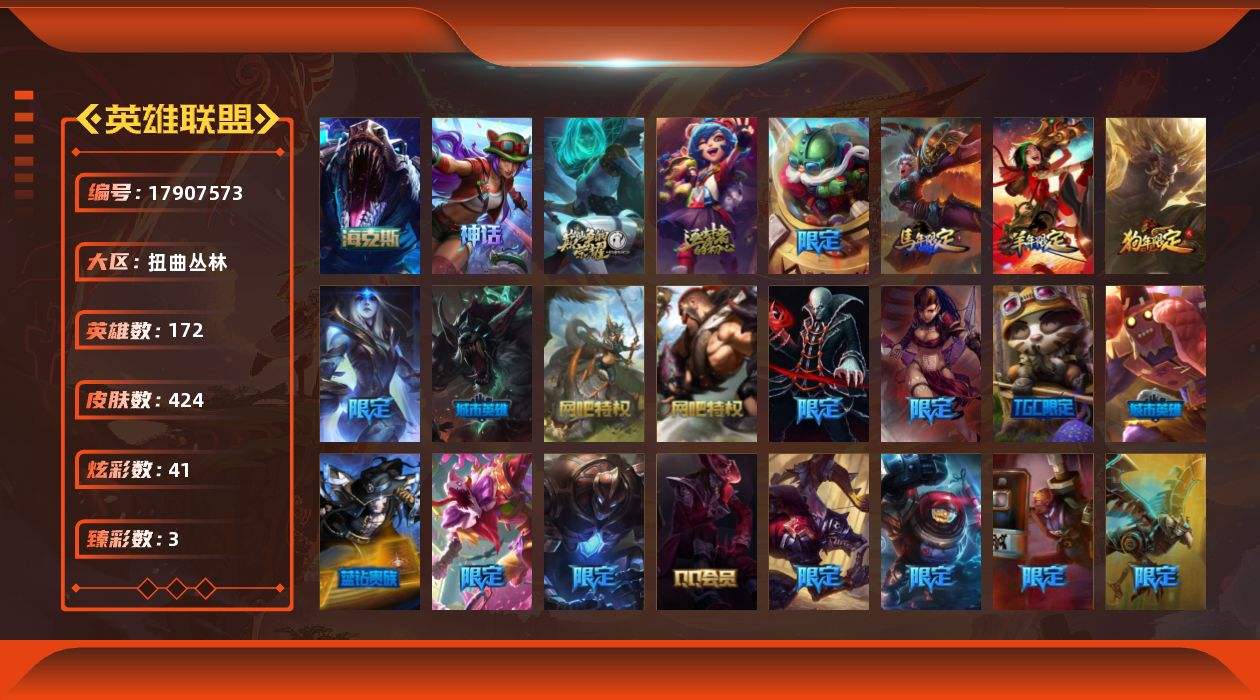 【592526】[17907573]【店主推荐捡漏号】黄金段位-172英雄-424皮肤-41炫彩-0终极-5神话-50限定-36传说-110史诗【神话皮肤】:十周年纪念安妮,源代码乐芙兰,十五周年纪念希维尔,神凰行者瑞羽圣凰艾尼维亚,海克斯科技雷克顿【热门头像】:觅心之翼奎因头像【臻彩皮肤】:征服者韦鲁斯炫金,星之守护者卡莎热情之光,最终BOSS维迦里大魔王【年限皮肤】:替父从军花木兰,神龙烈焰