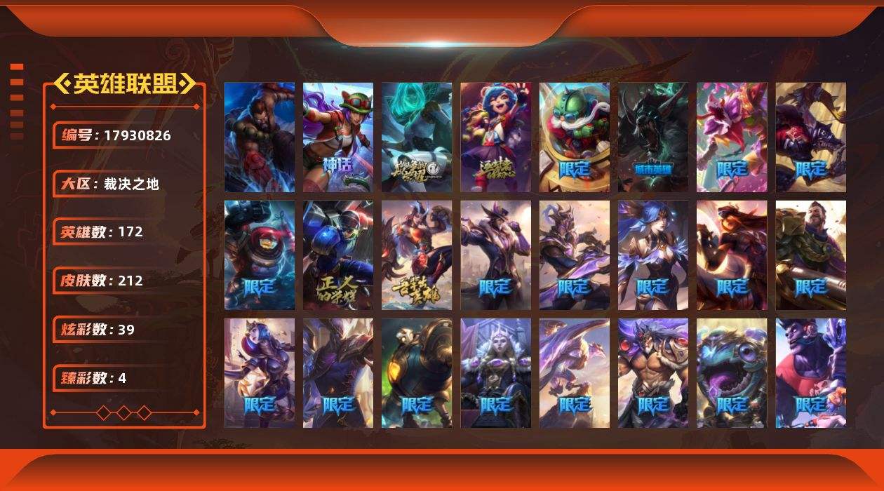 【596444】[17930826]铂金段位-172英雄-212皮肤-39炫彩-1终极-4神话-26限定-16传说-52史诗【神话皮肤】:十周年纪念安妮,源代码乐芙兰,十五周年纪念希维尔,神凰行者瑞羽圣凰艾尼维亚【臻彩皮肤】:冠军典狱长锤石凯旋圣装,可爱可爱粉红红布里茨,魔女阿卡丽虚荣【情人节限定】:觅心女王艾希【冰雪限定】:平安夜女神娑娜,圣诞驯鹿克格莫【终极皮肤】:灵魂守卫乌迪尔【限定皮肤】