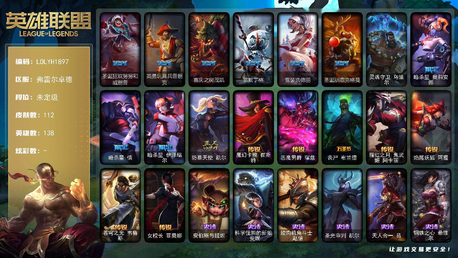 【597171】【LOLYH1897】138英雄/112皮肤/1终极/10限定/7传说/31史诗/未定级/至爱的鹿/卡特琳娜的匕首/圣诞狂欢努努和威朗普/英勇玩具兵普朗克/喜庆之树茂凯/雪默丁格/雪装奈德丽/圣诞驯鹿克格莫/灵魂守卫乌迪尔/暗杀星奥莉安娜/暗杀星慎/暗杀星伊泽瑞尔/防暴天使凯尔/魔幻卡牌崔斯特/恶魔男爵瑞兹/丧尸布兰德/腥红之月鬼舞姬阿卡丽/焰尾妖狐阿狸/苍穹之光韦鲁斯/女校长菲