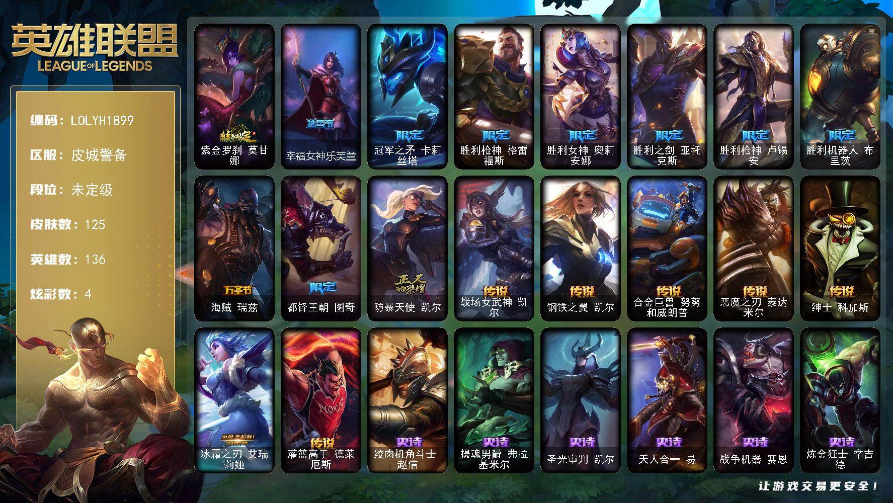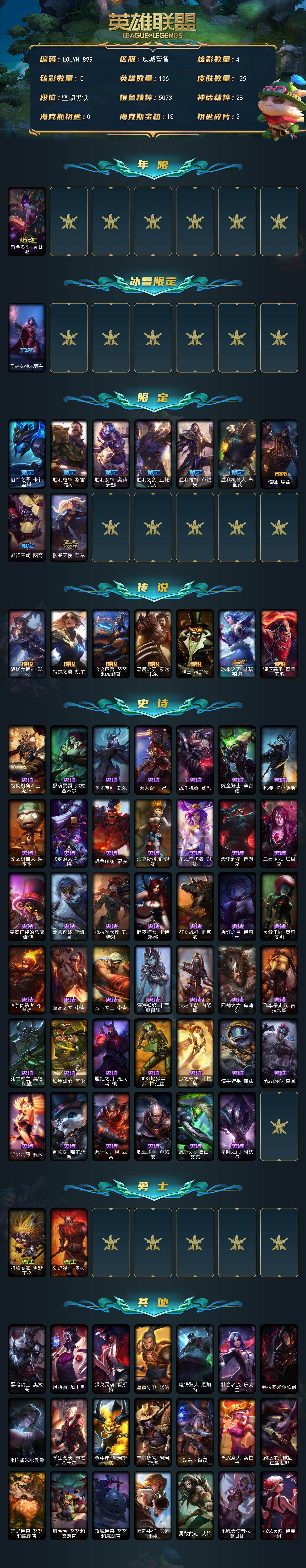 【597179】【LOLYH1899】136英雄/125皮肤/11限定/4炫彩/7传说/41史诗/未定级/紫金罗刹莫甘娜/幸福女神乐芙兰/冠军之矛卡莉斯塔/胜利枪神格雷福斯/胜利女神奥莉安娜/胜利之剑亚托克斯/胜利枪神卢锡安/胜利机器人布里茨/海贼瑞兹/都铎王朝图奇/防暴天使凯尔/战场女武神凯尔/钢铁之翼凯尔/合金巨兽努努和威朗普/恶魔之刃泰达米尔/绅士科加斯/冰霜之刃艾瑞莉娅/灌篮高手德莱厄斯