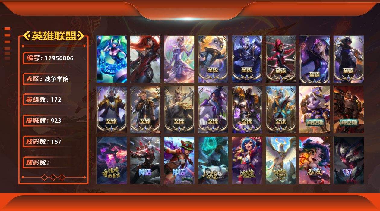 【600340】[17956006]3终极 20神话 141限定 89传说 173史诗 923皮肤 167炫彩 172英雄 可二次 可修改实名 【至臻】至臻 天龙之子 伊泽瑞尔,至臻 斗魂觉醒 派克,至臻 永恒星灵 佐伊,至臻 灵魂莲华 劫,至臻 黑色玫瑰假面舞会 卡特琳娜,至臻 暗星女王 黛安娜,至臻 真实伤害 赛娜,至臻 真实伤害 亚索,至臻 灵能特工 伊泽瑞尔,至臻 魔女 乐芙兰,至臻 灵