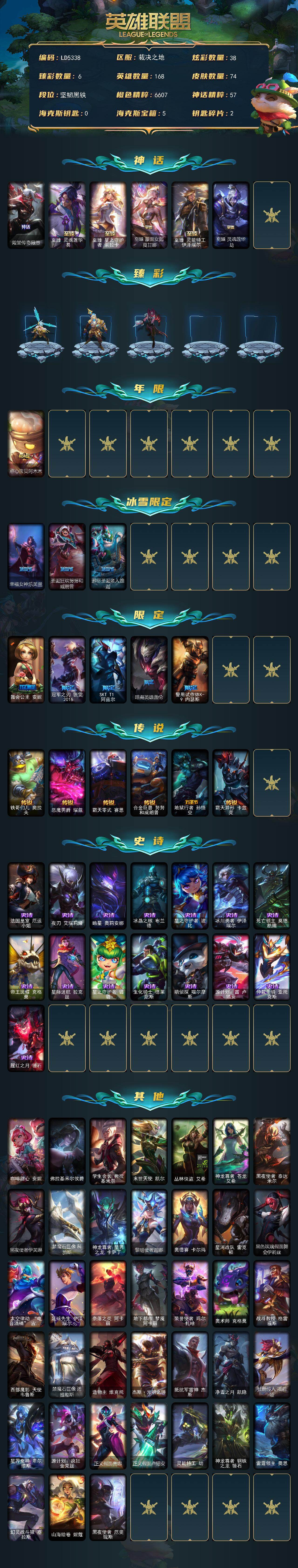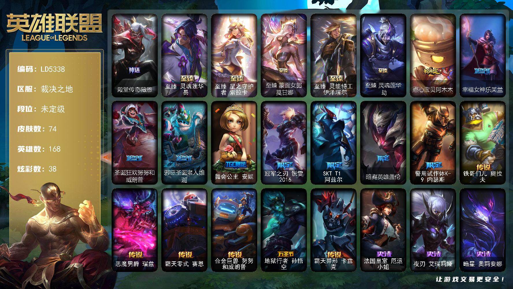 【601280】【LD5338】168英雄/74皮肤/6神话/9限定/6臻彩/38炫彩/6传说/15史诗/未定级/殿堂传奇薇恩/至臻灵魂莲华易/至臻星之守护者索拉卡/至臻蒙面女郎莫甘娜/至臻灵能特工伊泽瑞尔/至臻灵魂莲华劫/冰霜之刃艾瑞莉娅炫金/冠军之志瑞兹凯旋圣装/西部魔影卢锡安贝利尔之怠/海之歌艾希冰爽浪花/西部魔影执行人卡特琳娜纯洁/点心宝贝阿木木/幸福女神乐芙兰/圣诞狂欢努努和威朗普/邪