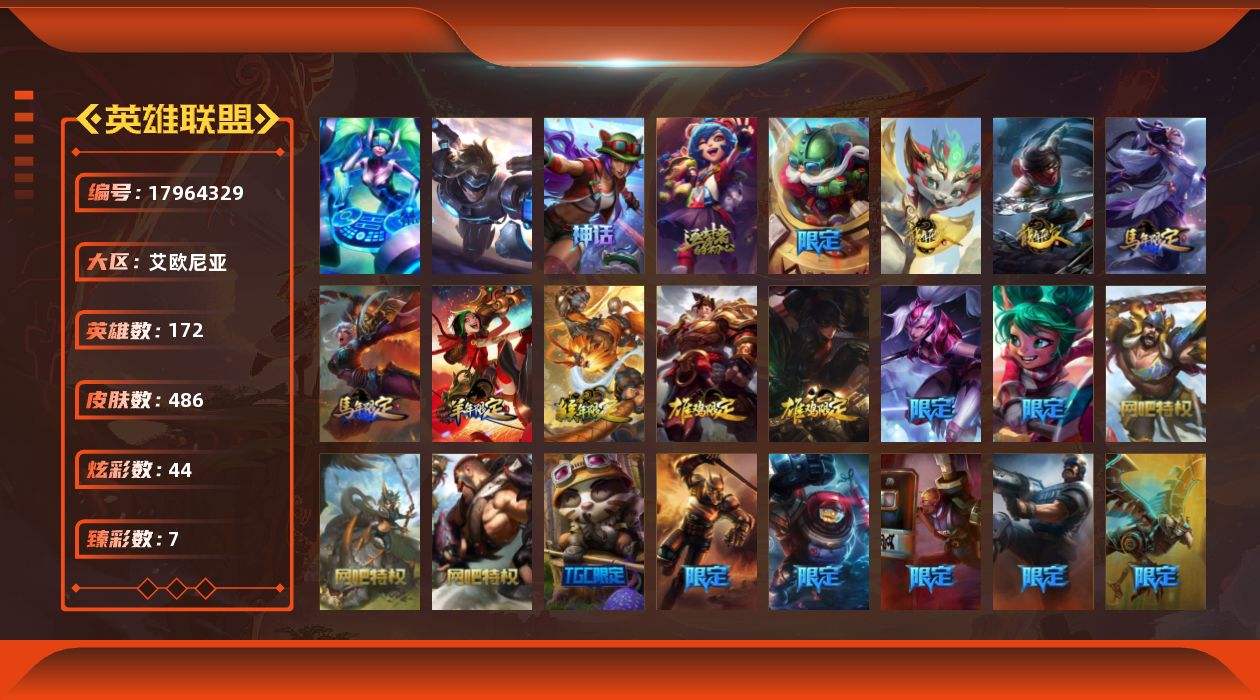 【601480】[17964329]铂金段位-172英雄-486皮肤-44炫彩-2终极-2神话-79限定-36传说-123史诗【神话皮肤】:十周年纪念安妮,十五周年纪念希维尔【臻彩皮肤】:天龙之子卡莎飞龙乘云,墨之影武者亚索金墨耀影,冠军之隐劫凯旋圣装,咖啡甜心璐璐焦糖布丁,幻灵战斗兔锐雯梦幻强袭,魔女阿卡丽虚荣,净雪之月莫甘娜冬虹【年限皮肤】:银龙裁决泰隆,碧玉之牙卡西奥佩娅,替父从军花木兰,