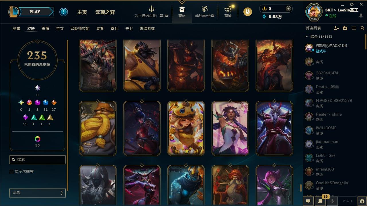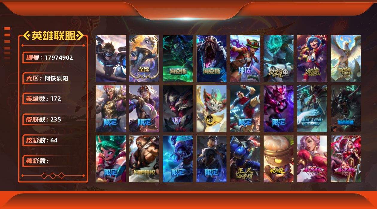 【602278】[17974902]1终极 8神话 31限定 27传说 53史诗 235皮肤 64炫彩 172英雄 可二次 可修改实名 【至臻】至臻 永恒星灵 佐伊 【海克斯】摄魂 薇恩,海克斯 雷克顿 【情人节限定】穿心之剑 菲奥娜,觅心女王 艾希 【赛季限定皮】胜利行刑官 德莱文,胜利女神-菲奥娜 【冠军限定系列】S13 T1 李青,S1FNC 迦娜,S2 暗杀星 蒙多,S3 SKT T1