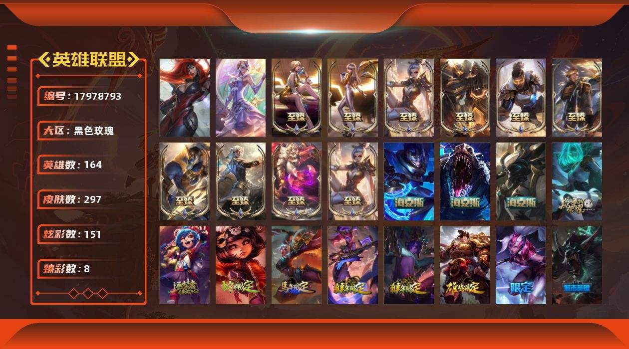 【602899】[17978793]未定级段位-164英雄-297皮肤-151炫彩-2终极-16神话-46限定-38传说-64史诗【神话皮肤】:十周年纪念安妮,源代码乐芙兰,神凰行者瑞羽圣凰艾尼维亚,海克斯科技嘉文四世,海克斯科技雷克顿,零之枪骑赫卡里姆,至臻飞升战神潘森,至臻黑夜使者凯隐,至臻KDA卡莎,至臻KDA伊芙琳,至臻灵能特工伊泽瑞尔,至臻神龙尊者均衡之龙沃利贝尔,至臻王国机神玄武盖伦
