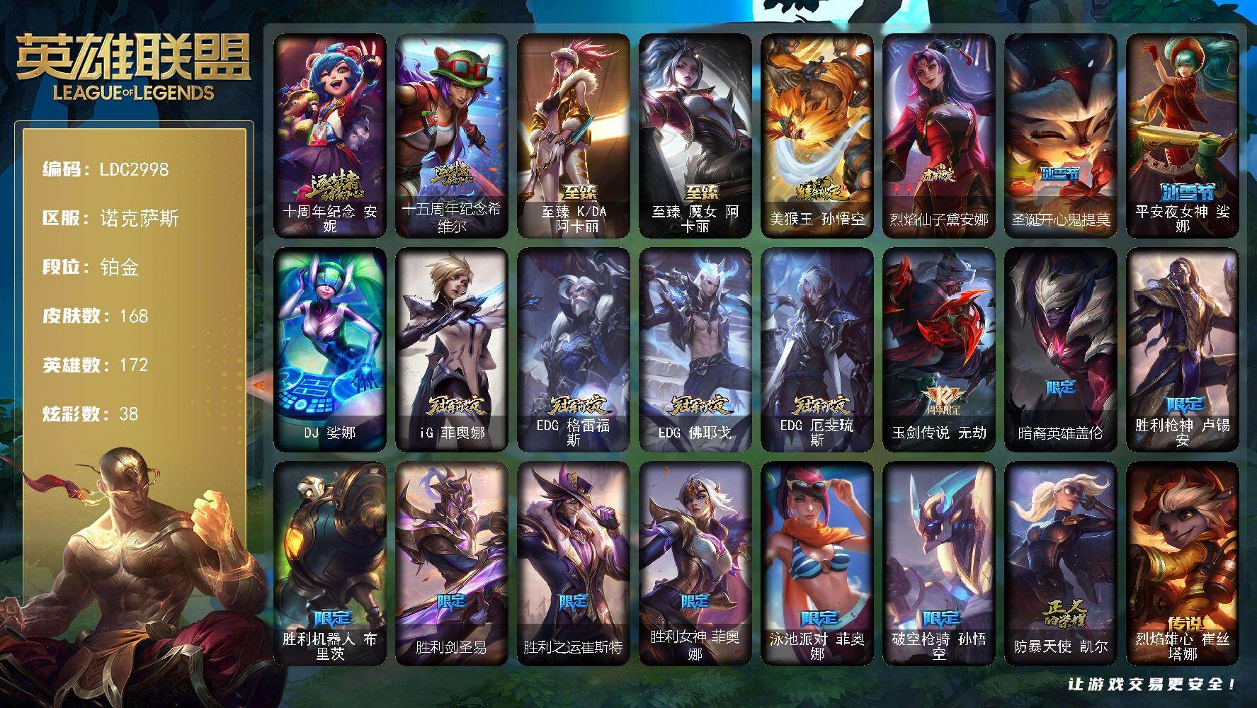 【603390】【LDC2998】172英雄/168皮肤/1终极/4神话/19限定/6臻彩/38炫彩/19传说/37史诗/铂金账号等级:702/十周年纪念安妮/十五周年纪念希维尔/至臻K/DA阿卡丽/至臻魔女阿卡丽/灵魂莲华锐雯流火/星之守护者卡莎热情之光/玉剑传说苍鸾丁香/幻灵战斗队长厄运小姐勇气赞歌/星之守护者阿卡丽未来之光/魔女阿卡丽虚荣/美猴王孙悟空/烈焰仙子黛安娜/圣诞开心鬼提莫/平安