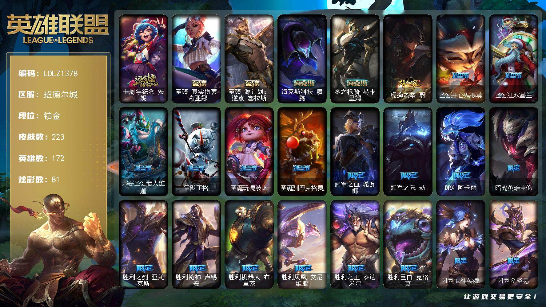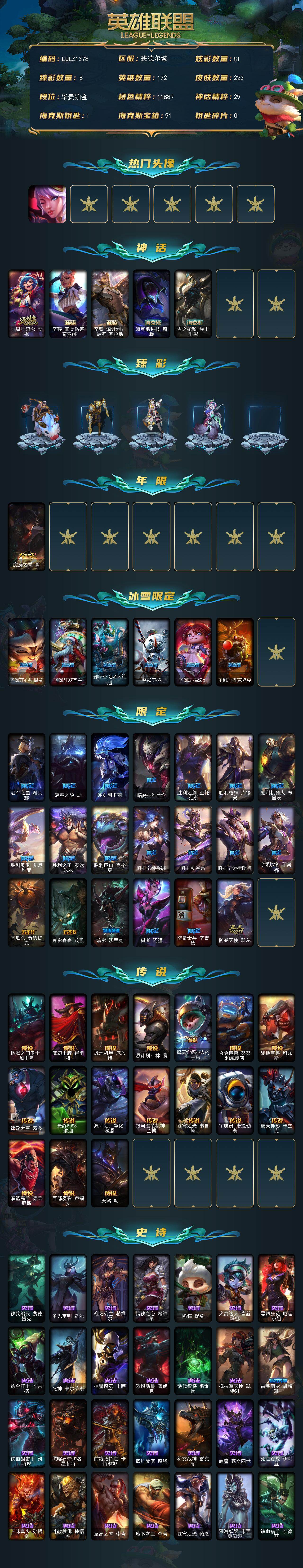 【603708】【LOLZ1378】172英雄/223皮肤/5神话/28限定/8臻彩/81炫彩/17传说/60史诗/铂金/觅心之翼奎因/十周年纪念安妮/至臻真实伤害奇亚娜/至臻源计划:逆流塞拉斯/海克斯科技魔腾/零之枪骑赫卡里姆/无畏骑士瑟庄妮赤子初心/冠军之隐劫凯旋圣装/咖啡甜心金克丝核桃巴菲/星之守护者阿卡丽热情之光/魔女阿卡丽虚荣/净雪之月莫甘娜冬虹/花仙子崔丝塔娜蓝闪/虎痴之拳蔚/圣诞开