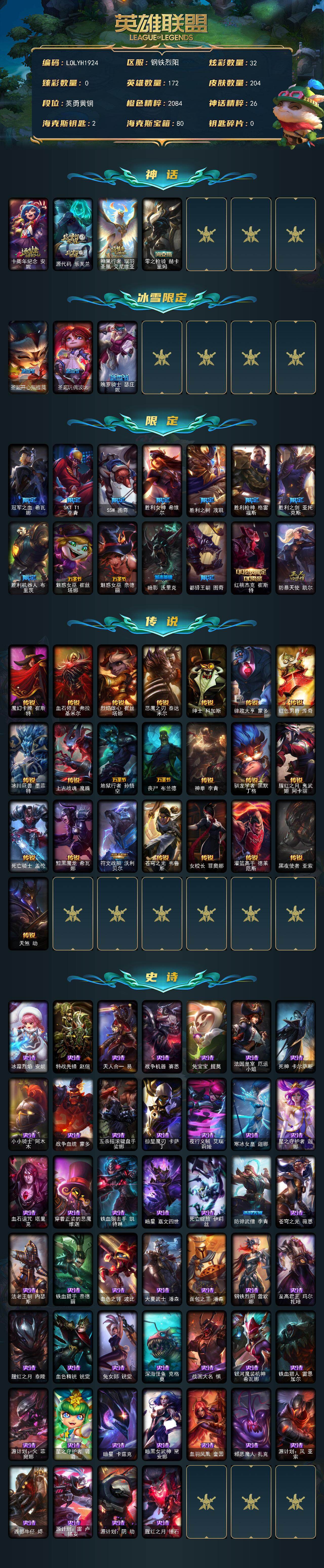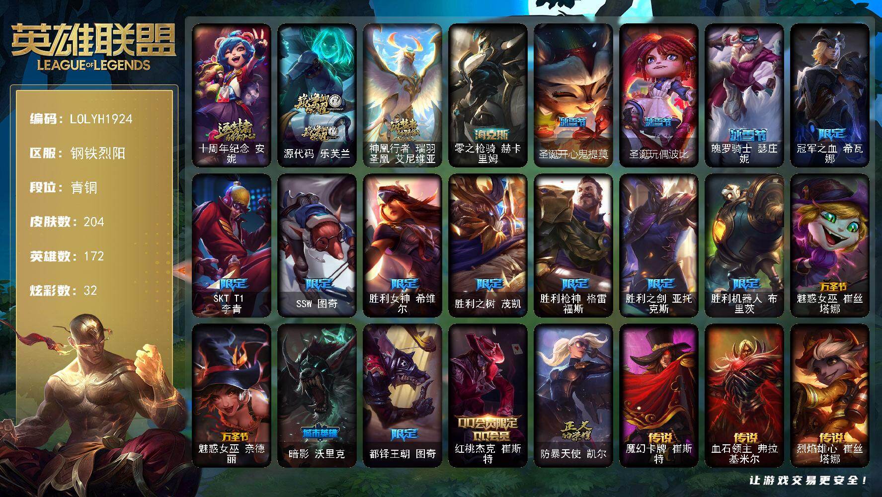 【603962】【LOLYH1924】172英雄/204皮肤/4神话/17限定/32炫彩/22传说/46史诗/青铜/十周年纪念安妮/源代码乐芙兰/神凰行者瑞羽凤凰艾尼维亚/零之枪骑赫卡里姆/圣诞开心鬼提莫/圣诞玩偶波比/魄罗骑士瑟庄妮/冠军之血希瓦娜/SKTT1李青/SSW图奇/胜利女神希维尔/胜利之树茂凯/胜利枪神格雷福斯/胜利之剑亚托克斯/胜利机器人布里茨/魅惑女巫崔丝塔娜/魅惑女巫奈德丽/
