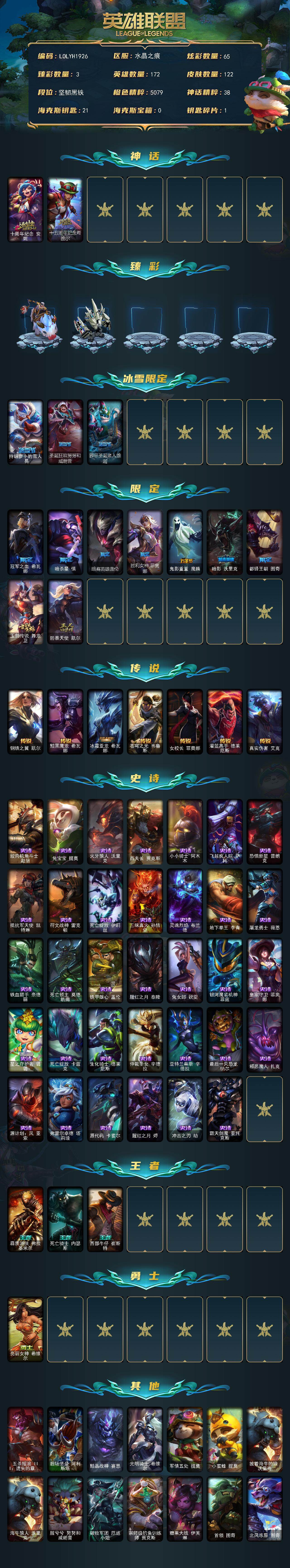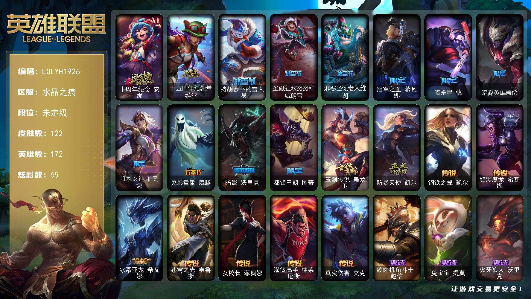 【603965】【LOLYH1926】172英雄/122皮肤/2神话/13限定/3臻彩/65炫彩/7传说/34史诗/未定级/十周年纪念安妮/十五周年纪念希维尔/无畏骑士瑟庄妮赤子初心/霸天巨兽雪崩墨菲特/持胡萝卜的雪人易/圣诞狂欢努努和威朗普/邪恶圣诞老人维迦/冠军之血希瓦娜/暗杀星慎/暗裔英雄盖伦/胜利女神菲奥娜/鬼影重重魔腾/暗影妖狐阿狸/都铎王朝图奇/玉剑传说舞龙卫/防暴天使凯尔/钢铁之翼