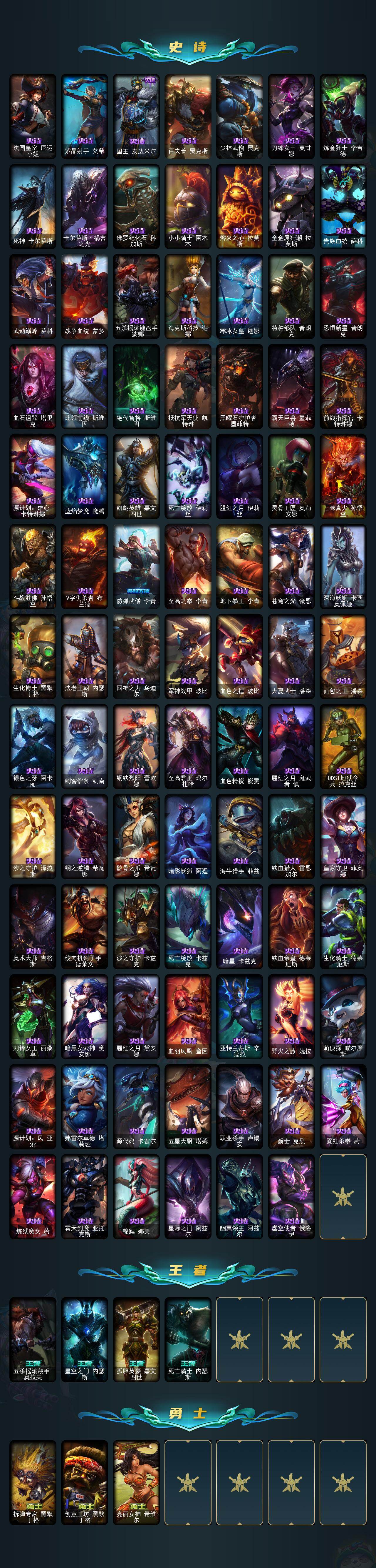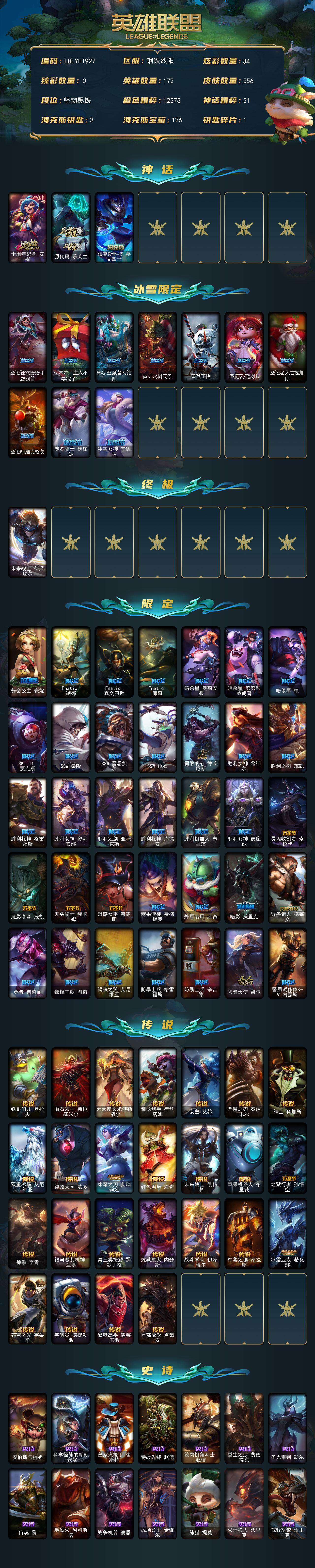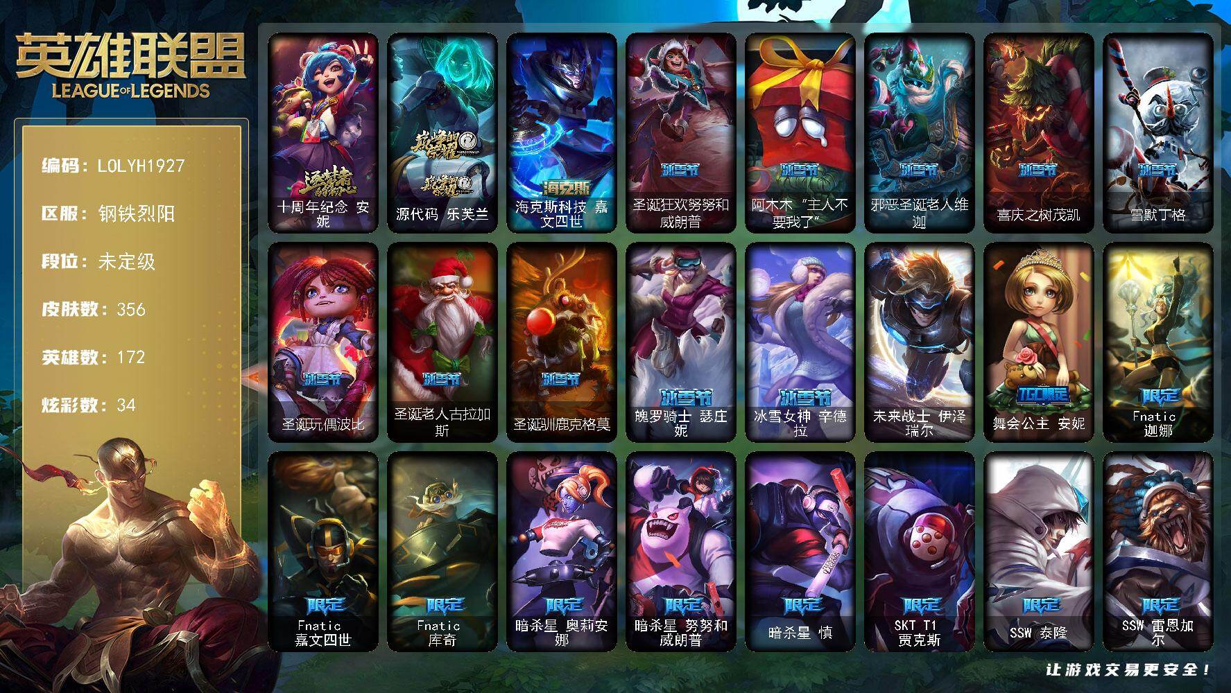 【603969】【LOLYH1927】172英雄/356皮肤/1终极/3神话/45限定/34炫彩/25传说/104史诗/未定级/十周年纪念安妮/源代码乐芙兰/海克斯科技嘉文四世/圣诞狂欢努努和威朗普/阿木木:“主人不要我了”/邪恶圣诞老人维迦/喜庆之树茂凯/雪默丁格/圣诞玩偶波比/圣诞老人古拉加斯/圣诞驯鹿克格莫/魄罗骑士瑟庄妮/冰雪女神辛德拉/未来战士伊泽瑞尔/舞会公主安妮/Fnatic迦娜/