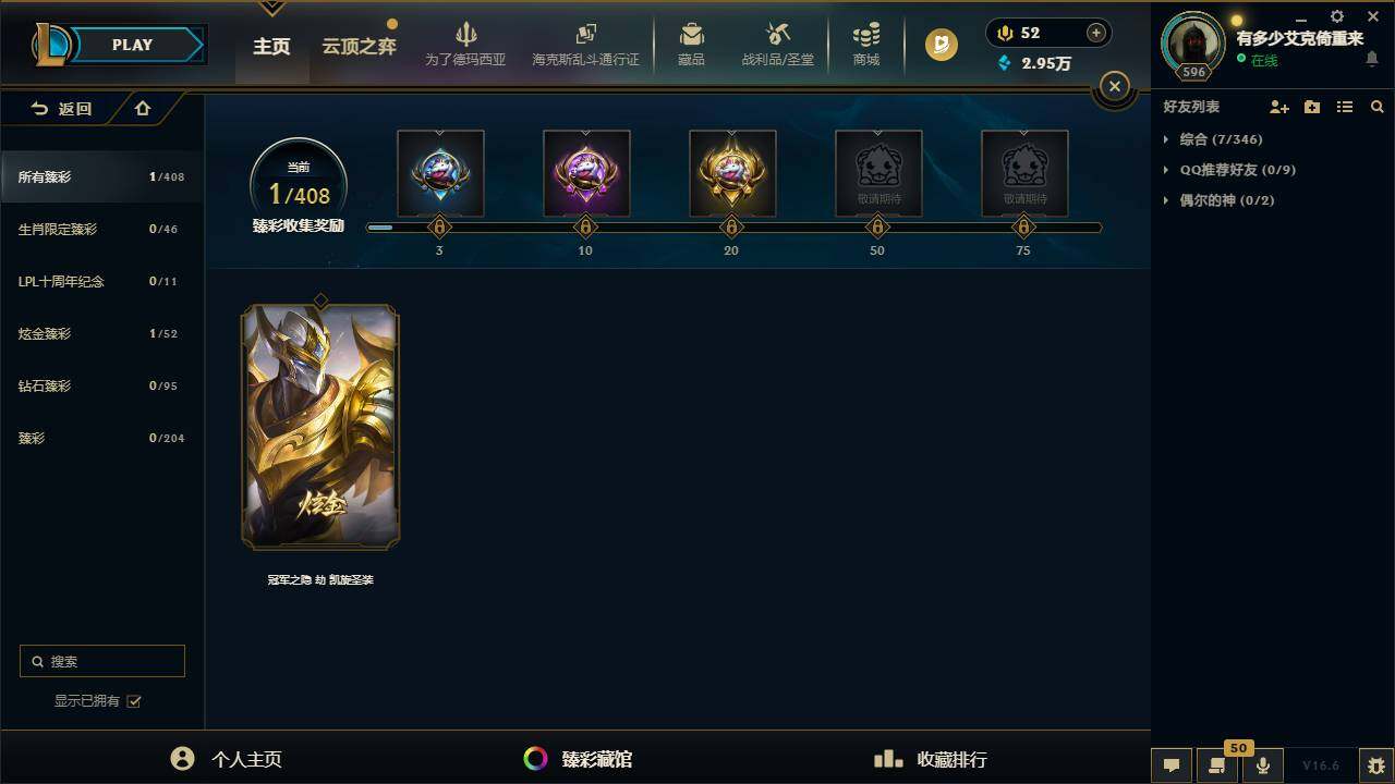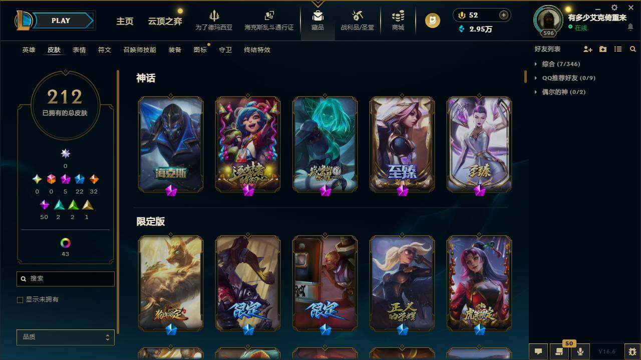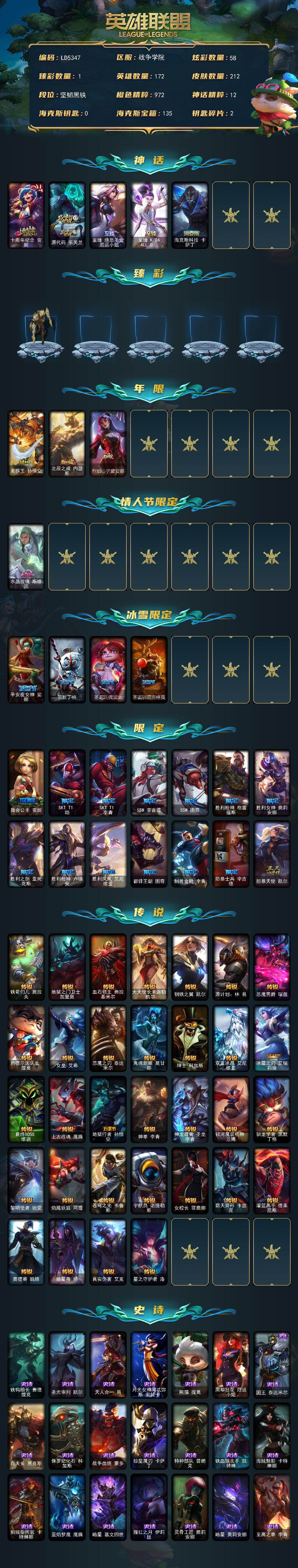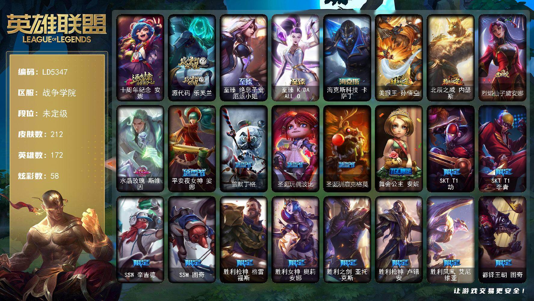 【606277】【LD5347】172英雄/212皮肤/5神话/22限定/1臻彩/58炫彩/32传说/50史诗/未定级/十周年纪念安妮/源代码乐芙兰/至臻绝息圣堂厄运小姐/至臻K/DAALLOUT卡莎/海克斯科技卡萨丁/冠军之隐劫凯旋圣装/美猴王孙悟空/北辰之威内瑟斯/烈焰仙子黛安娜/水晶玫瑰斯维因/平安夜女神娑娜/雪默丁格/圣诞玩偶波比/圣诞驯鹿克格莫/舞会公主安妮/SKTT1劫/SKTT1李