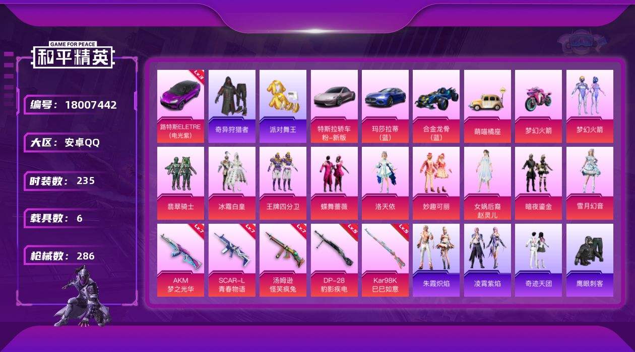 【606907】【可二次】【安卓QQ】合金龙骨蓝色 双人摩托梦幻火箭 王牌四分卫 奇异狩猎者 洛天依 特斯拉R沁心粉 翡翠骑士 萌喵橘座 玛莎拉蒂蓝色 蝶舞蔷薇 梦幻火箭 AKM-梦之光华 汤姆逊-怪笑疯兔 SCAR-L-青春物语