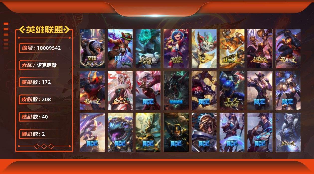 【607149】[18009542]青铜段位-172英雄-208皮肤-40炫彩-0终极-4神话-28限定-25传说-44史诗【神话皮肤】:十周年纪念安妮,源代码乐芙兰,十五周年纪念希维尔,至臻源计划阴劫【至臻皮肤】:至臻源计划阴劫【臻彩皮肤】:无畏骑士瑟庄妮赤子初心,赵云子龙炫金将军【年限皮肤】:美猴王孙悟空,烈焰美人薇恩,福牛守护者德莱厄斯,福牛守护者嘉文四世,剪纸仙灵艾瑞莉娅,天龙之子斯莫德