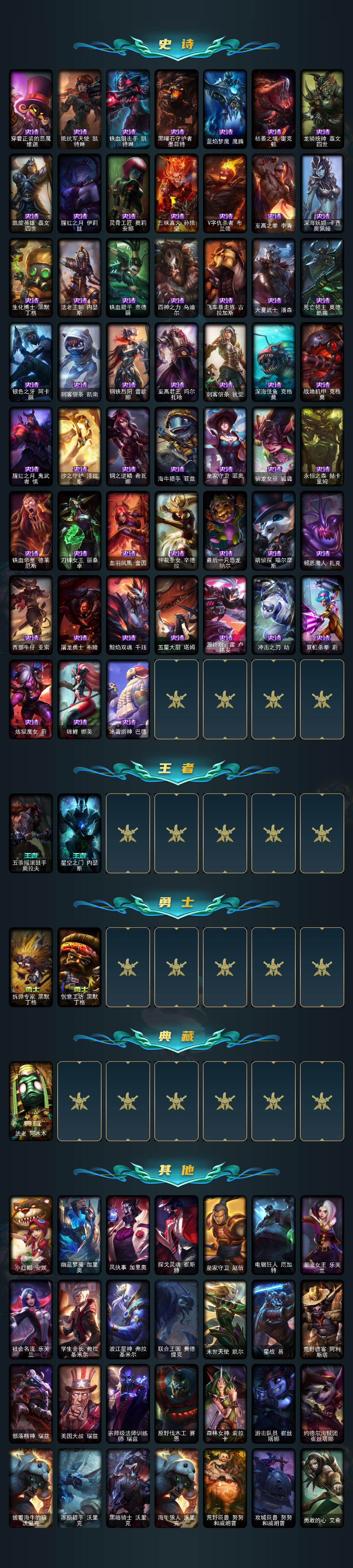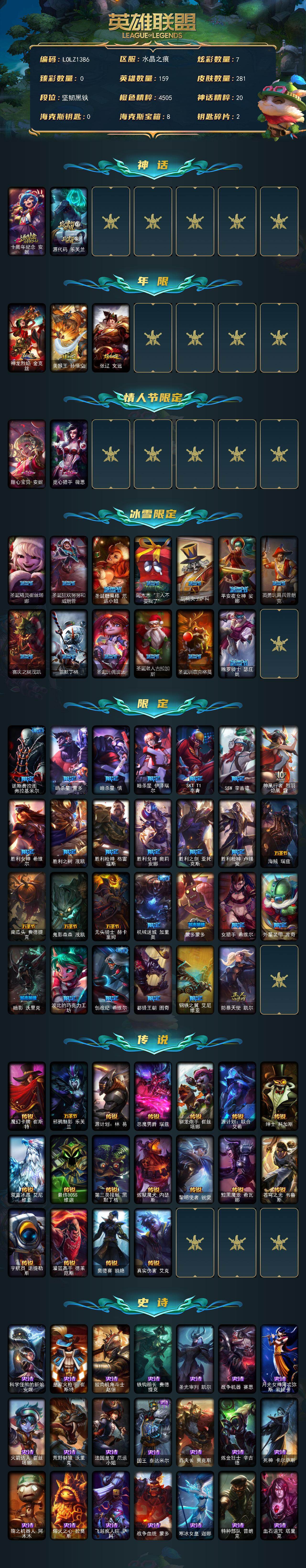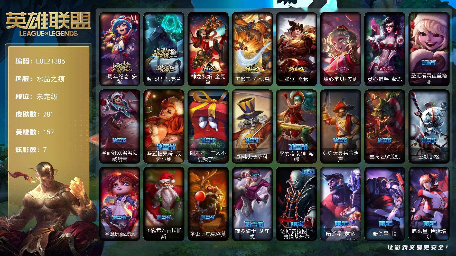【608091】【LOLZ1386】159英雄/281皮肤/2神话/45限定/7炫彩/18传说/73史诗/未定级/十周年纪念安妮/源代码乐芙兰/神龙烈焰金克丝/美猴王孙悟空/张辽文远/甜心宝贝安妮/觅心猎手薇恩/圣诞精灵崔丝塔娜/圣诞狂欢努努和威朗普/圣诞糖果棒厄运小姐/阿木木:“主人不要我了”/胡桃夹子萨科/平安夜女神娑娜/英勇玩具兵普朗克/喜庆之树茂凯/雪默丁格/圣诞玩偶波比/圣诞老人古拉加