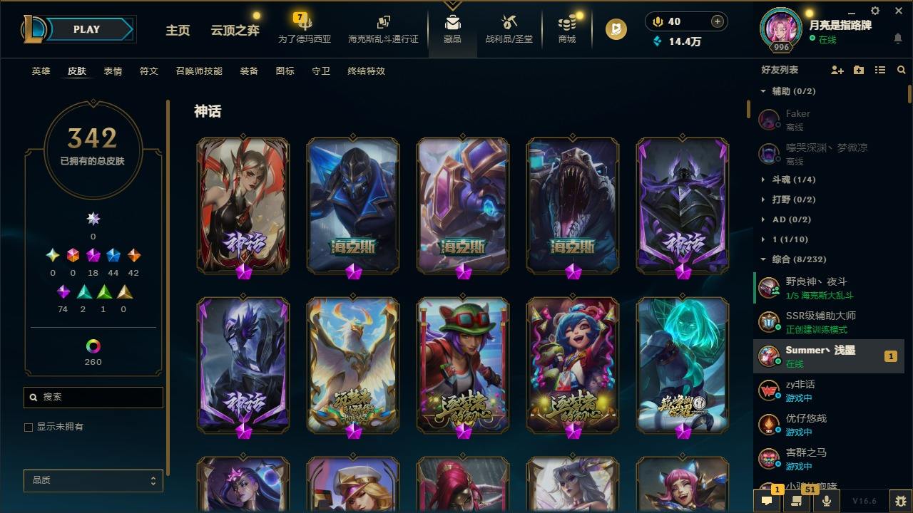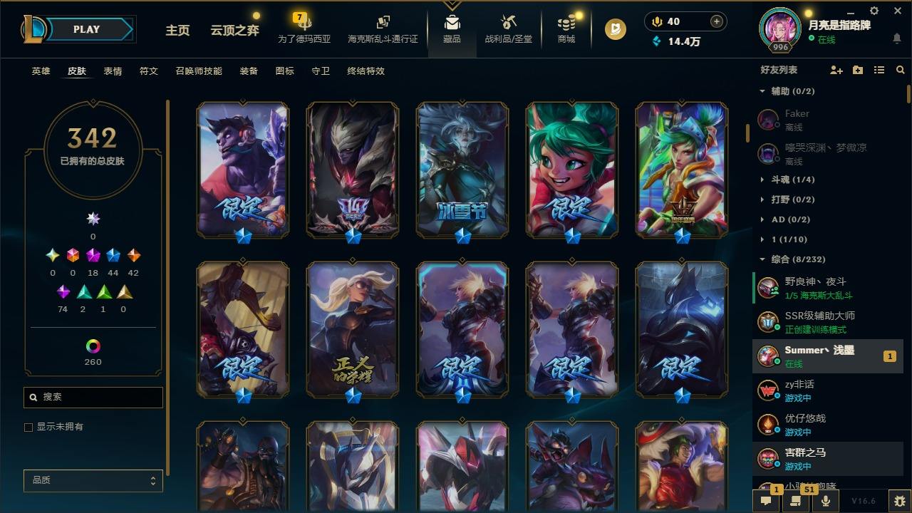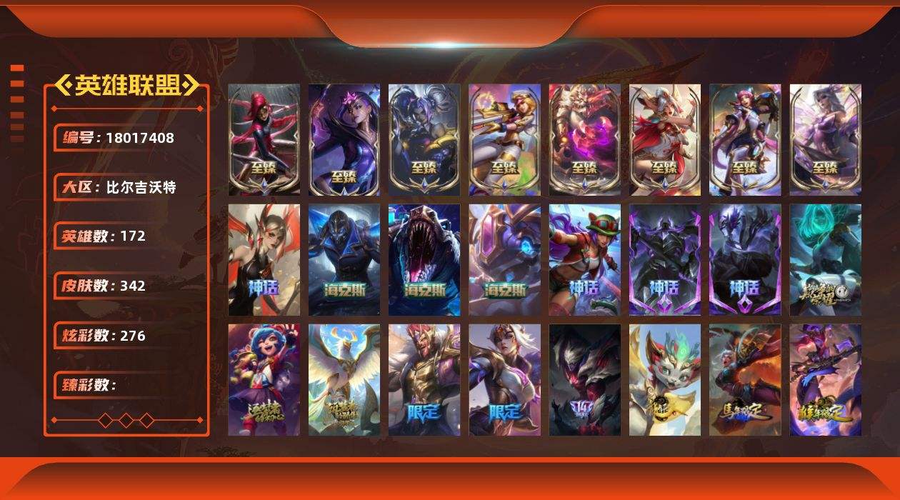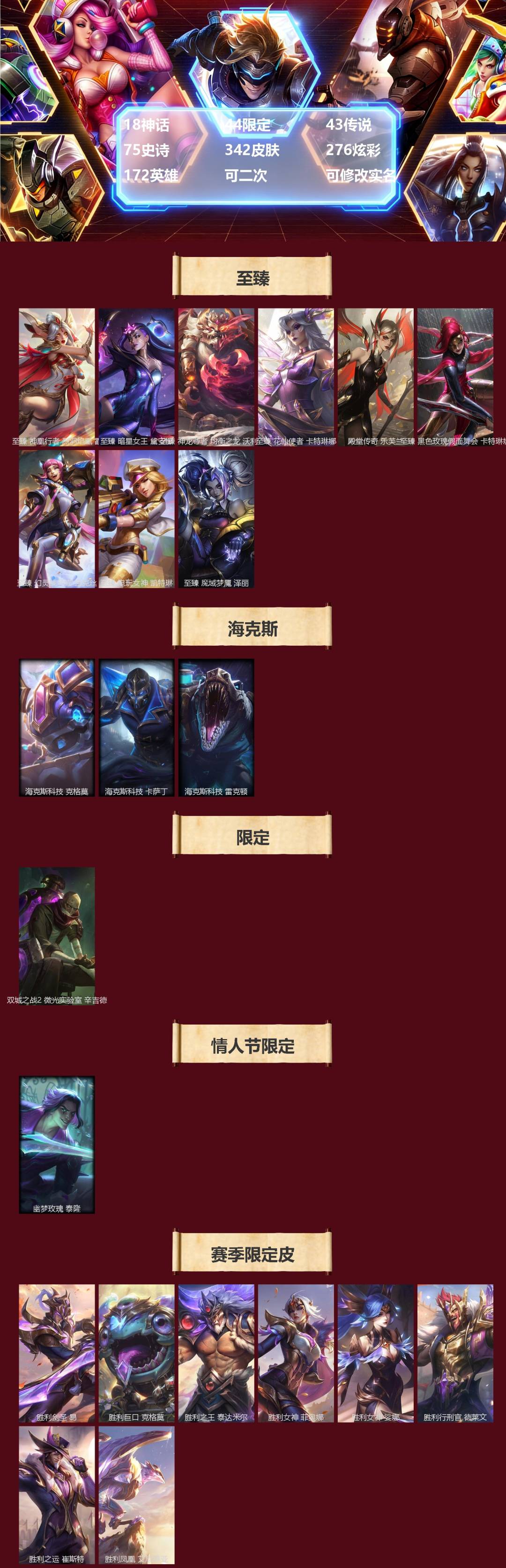 【608473】[18017408]18神话 44限定 43传说 75史诗 342皮肤 276炫彩 172英雄 可二次 可修改实名 【至臻】至臻 花仙使者 卡特琳娜,至臻 黑色玫瑰假面舞会 卡特琳娜,至臻 暗星女王 黛安娜,至臻 魔域梦魇 泽丽,至臻 电玩女神 凯特琳,至臻 神龙尊者均衡之龙 沃利贝尔,至臻 神凰行者 烈羽焰凰 霞,至臻 幻灵战斗猫 金克丝,殿堂传奇 乐芙兰【海克斯】海克斯 卡萨