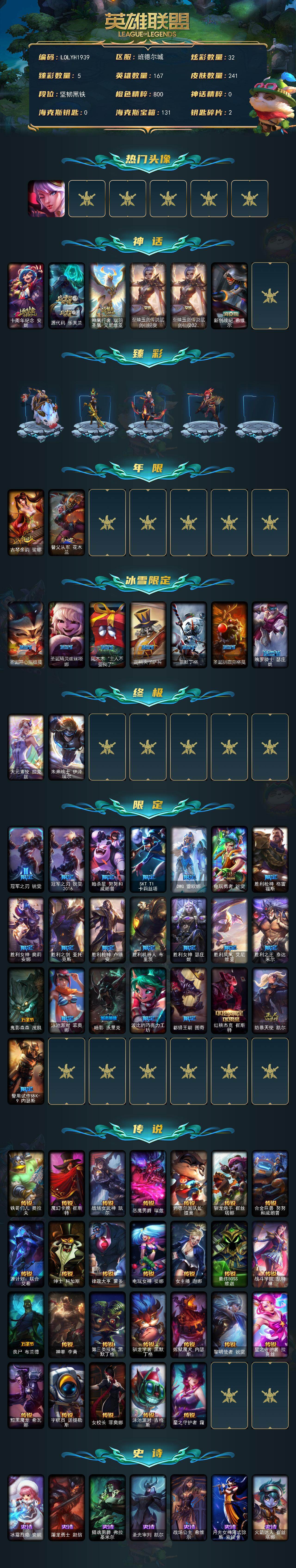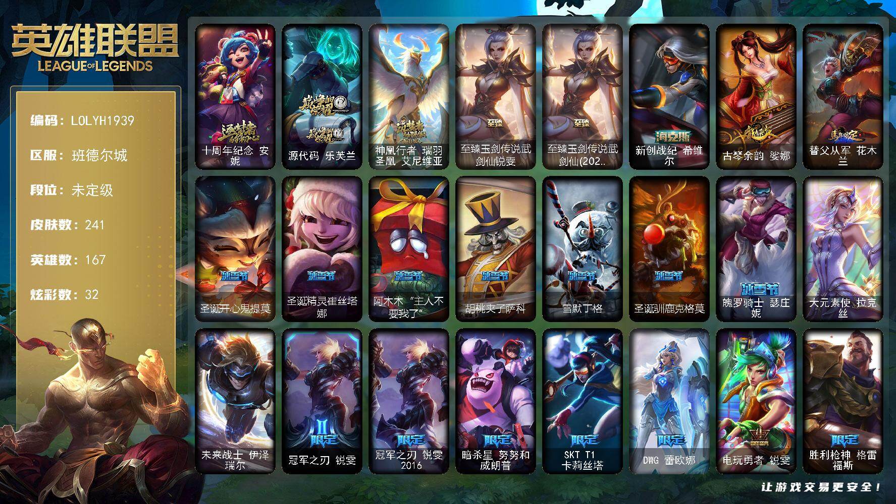 【608920】【LOLYH1939】167英雄/241皮肤/2终极/6神话/31限定/5臻彩/32炫彩/26传说/61史诗/未定级账号等级:284/觅心之翼奎因/十周年纪念安妮/源代码乐芙兰/神凰行者瑞羽凤凰艾尼维亚/至臻玉剑传说武剑仙/至臻玉剑传说武剑仙(2022)/新创战纪希维尔/无畏骑士瑟庄妮赤子初心/玉净夜叉凯特琳炫金神机/冠军之刃锐雯2016凯旋圣装/源计划联合艾希红莲之弓/黎明使者