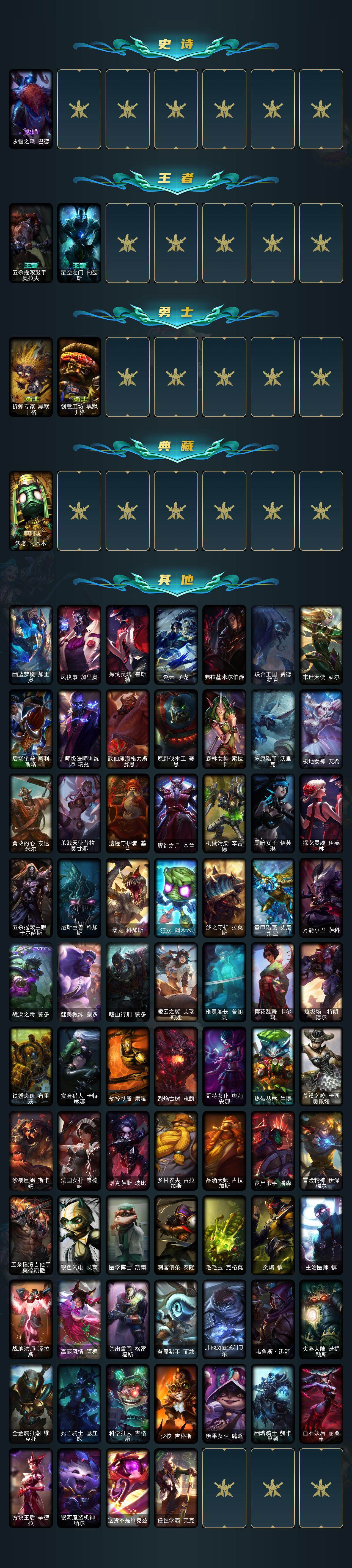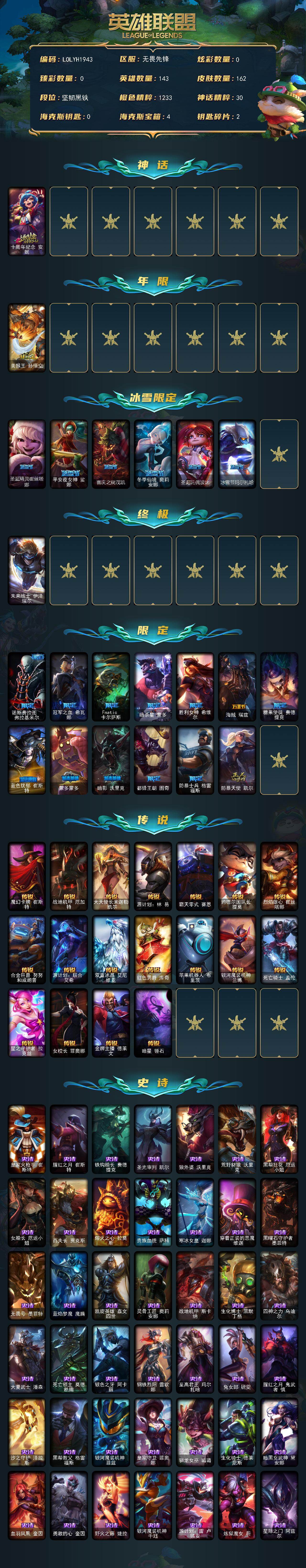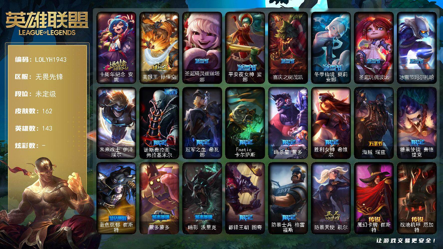 【608950】【LOLYH1943】143英雄/162皮肤/1终极/1神话/20限定/18传说/43史诗/未定级/十周年纪念安妮/美猴王孙悟空/圣诞精灵崔丝塔娜/平安夜女神娑娜/喜庆之树茂凯/冬季仙境奥莉安娜/圣诞玩偶波比/冰雪节玛尔扎哈/未来战士伊泽瑞尔/诺斯费拉图费拉基米尔/冠军之血希瓦娜/Fnatic卡尔萨斯/暗杀星蒙多/胜利女神希维尔/海贼瑞兹/糖果使徒费德提克/蓝色忧郁崔斯特/蒙多蒙