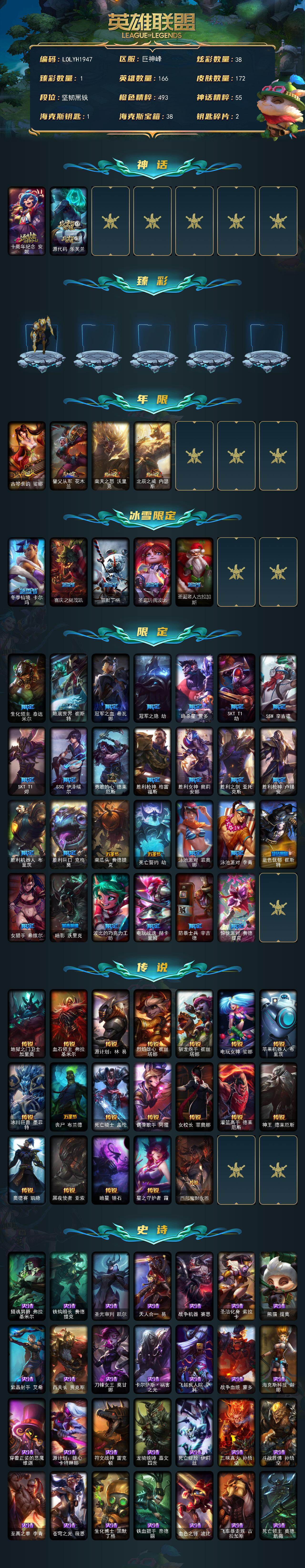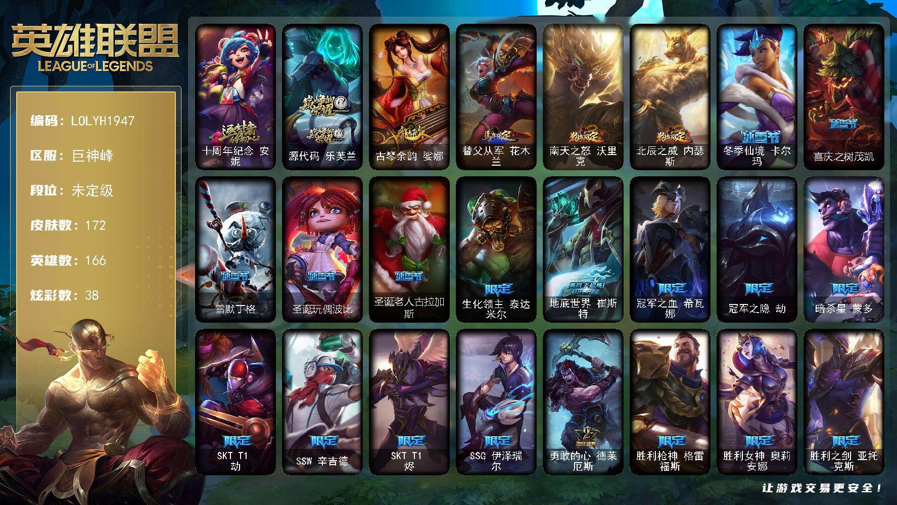【608974】【LOLYH1947】166英雄/172皮肤/2神话/36限定/1臻彩/38炫彩/19传说/47史诗/未定级/十周年纪念安妮/源代码乐芙兰/冠军之隐劫凯旋圣装/古琴余韵娑娜/替父从军花木兰/南天之怒沃里克/北辰之威内瑟斯/冬季仙境卡尔玛/喜庆之树茂凯/雪默丁格/圣诞玩偶波比/圣诞老人古拉加斯/生化领主泰达米尔/地底世界崔斯特/冠军之血希瓦娜/冠军之隐劫/暗杀星蒙多/SKTT1劫/