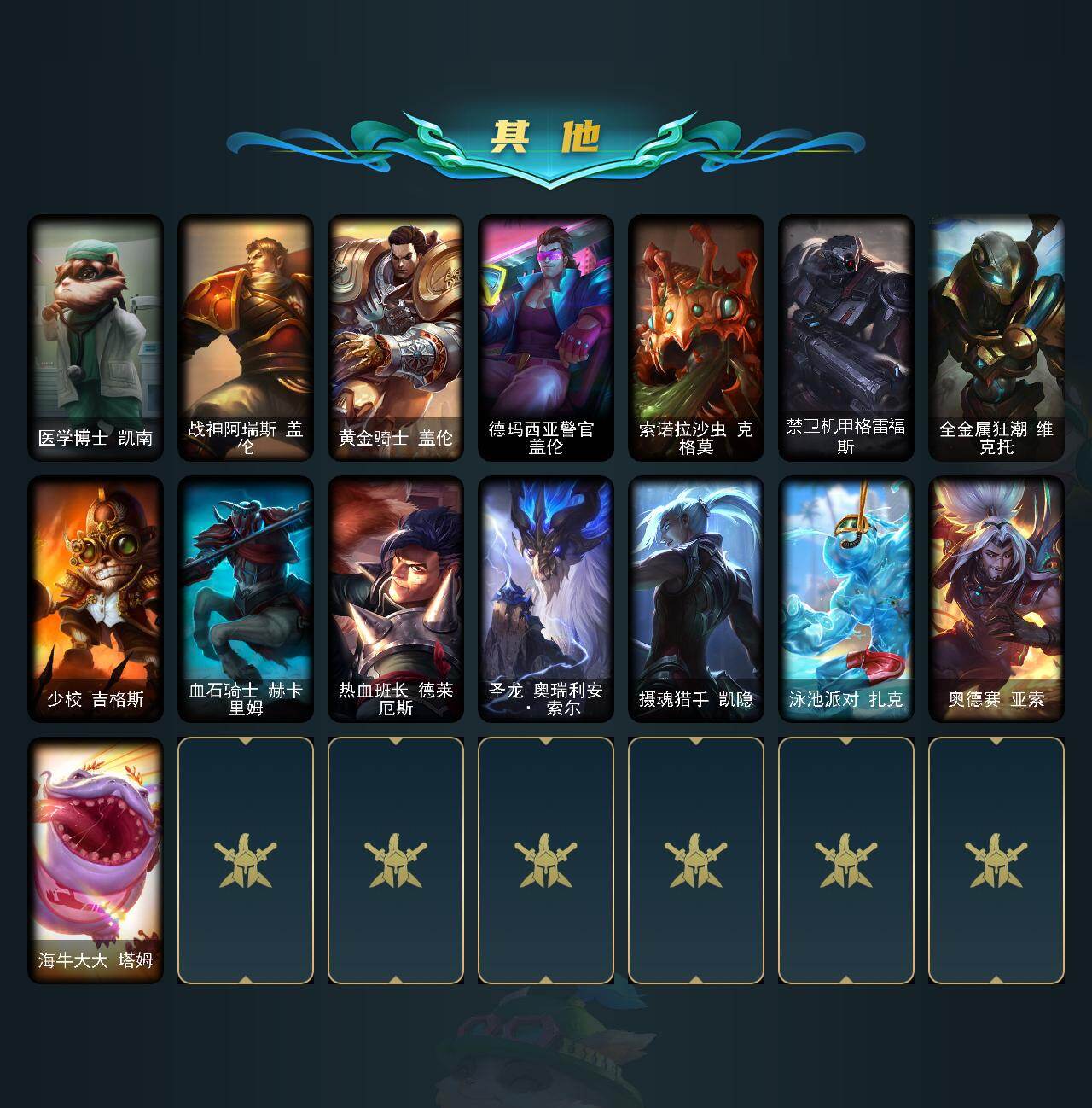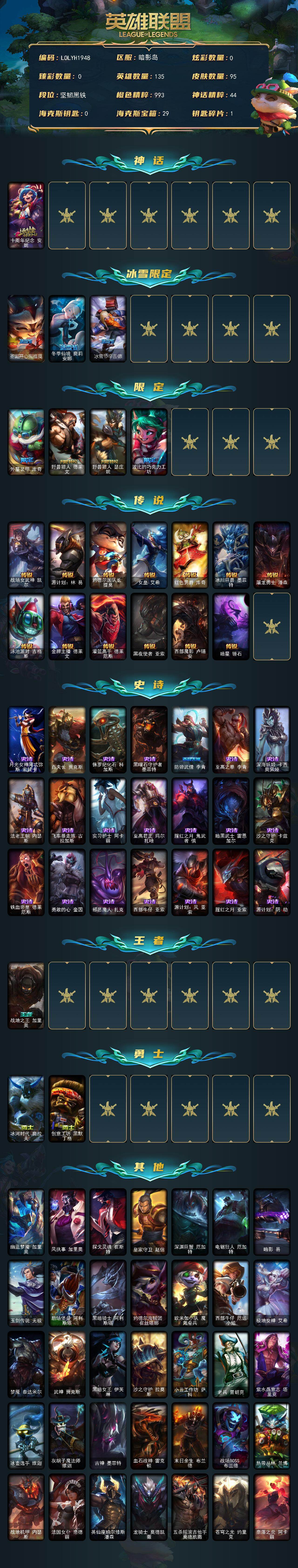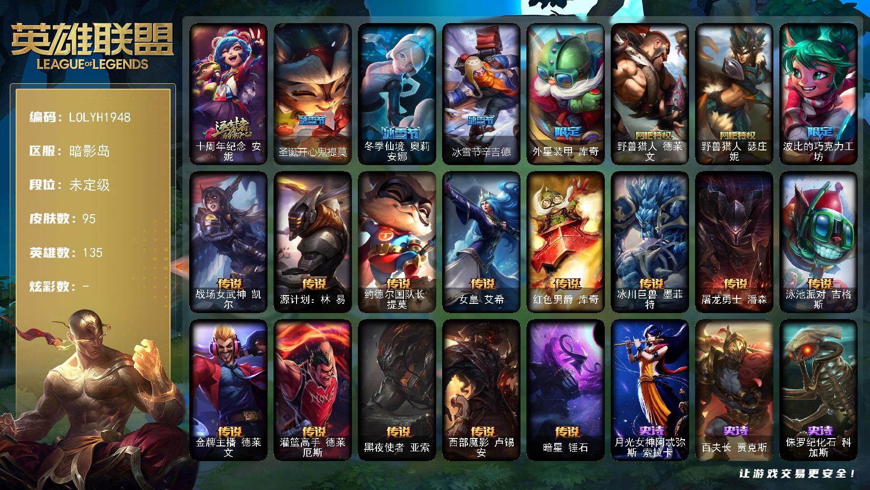 【608976】【LOLYH1948】135英雄/95皮肤/1神话/7限定/13传说/21史诗/未定级/十周年纪念安妮/圣诞开心鬼提莫/冬季仙境奥莉安娜/冰雪节辛吉德/外星装甲库奇/野兽猎人德莱文/野兽猎人瑟庄妮/波比的巧克力工坊/战场女武神凯尔/源计划:林易/约德尔国队长提莫/女皇艾希/红色男爵库奇/冰川巨兽墨菲特/屠龙勇士潘森/泳池派对吉格斯/金牌主播德莱文/灌篮高手德莱厄斯/黑夜使者亚索/