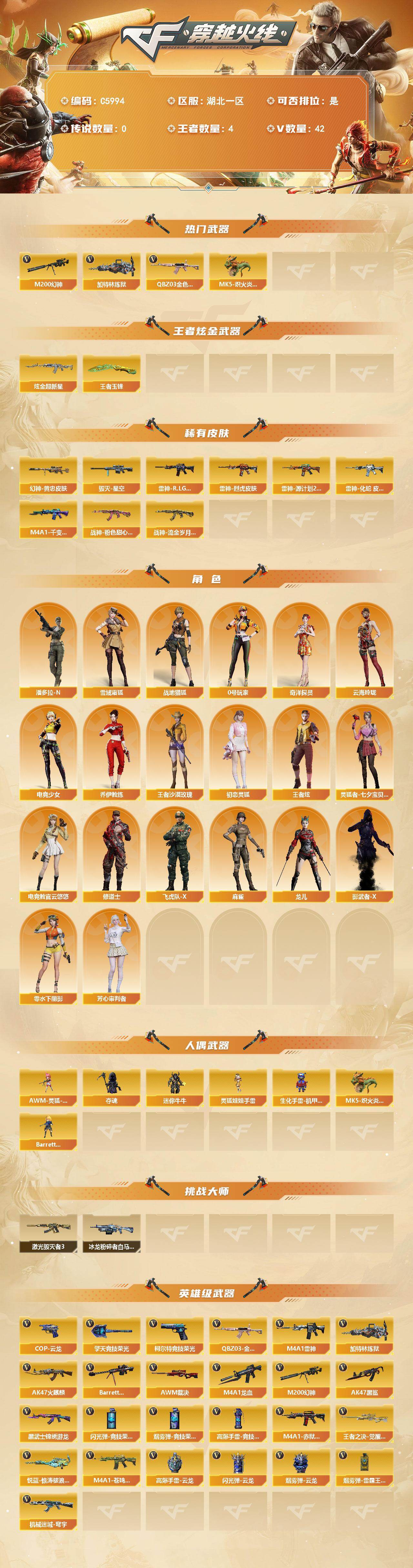 【610891】【610891】【C5994】湖北一区-44V-4王者武器数-1炫金武器数【热门武器】:QBZ03-金色蔷薇,M200-幻神,加特林-炼狱,M
