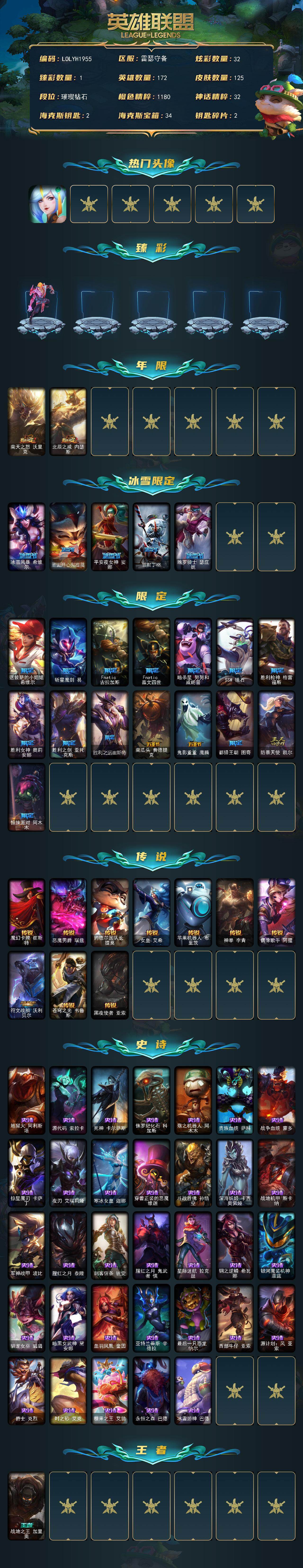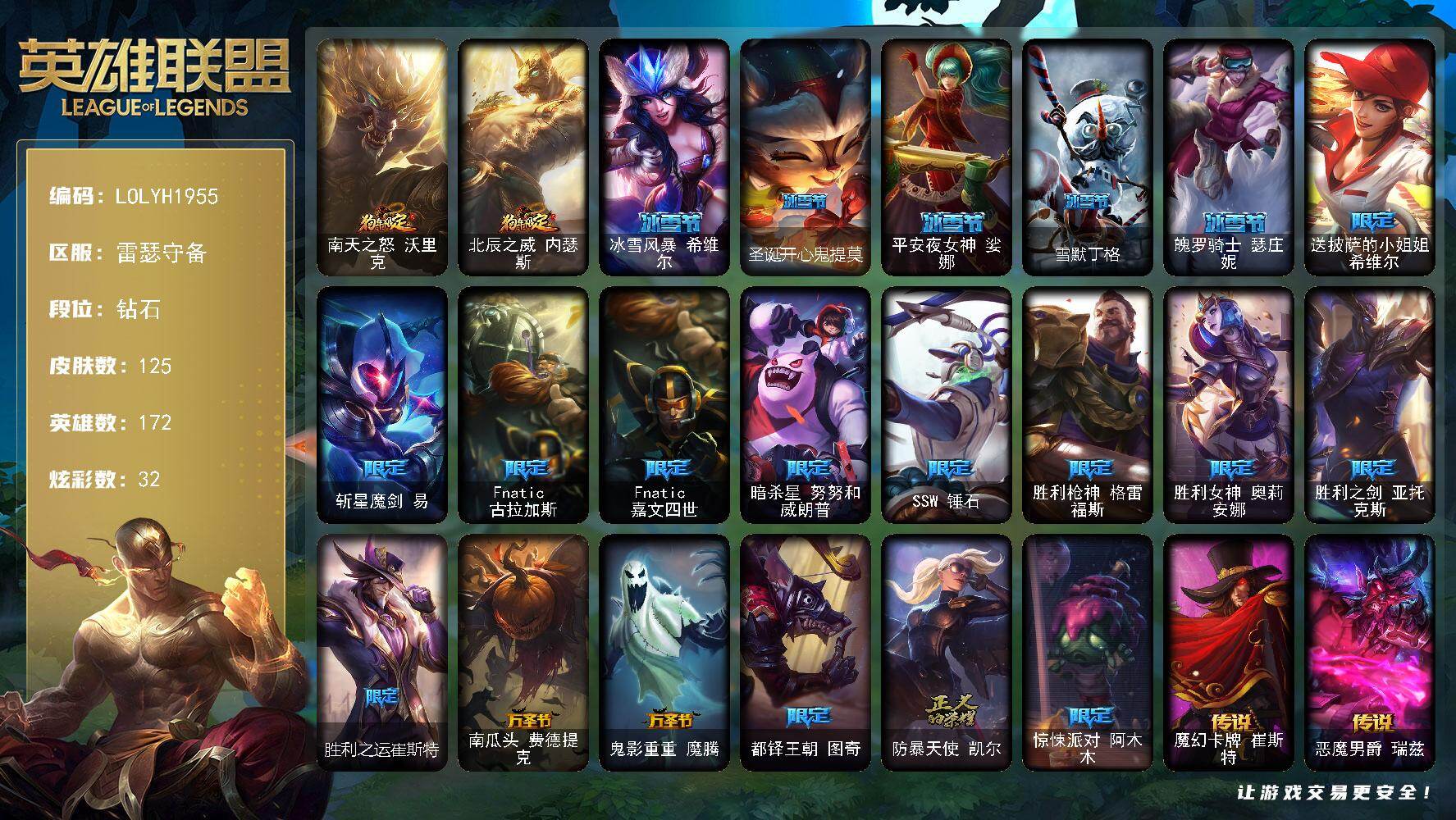 【611464】【LOLYH1955】172英雄/125皮肤/23限定/1臻彩/32炫彩/10传说/33史诗/钻石/春晖神女/神龙尊者圣龙李青登龙/南天之怒沃里克/北辰之威内瑟斯/冰雪风暴希维尔/圣诞开心鬼提莫/平安夜女神娑娜/雪默丁格/魄罗骑士瑟庄妮/送披萨的小姐姐希维尔/斩星魔剑易/Fnatic古拉加斯/Fnatic嘉文四世/暗杀星努努和威朗普/SSW锤石/胜利枪神格雷福斯/胜利女神奥莉安娜