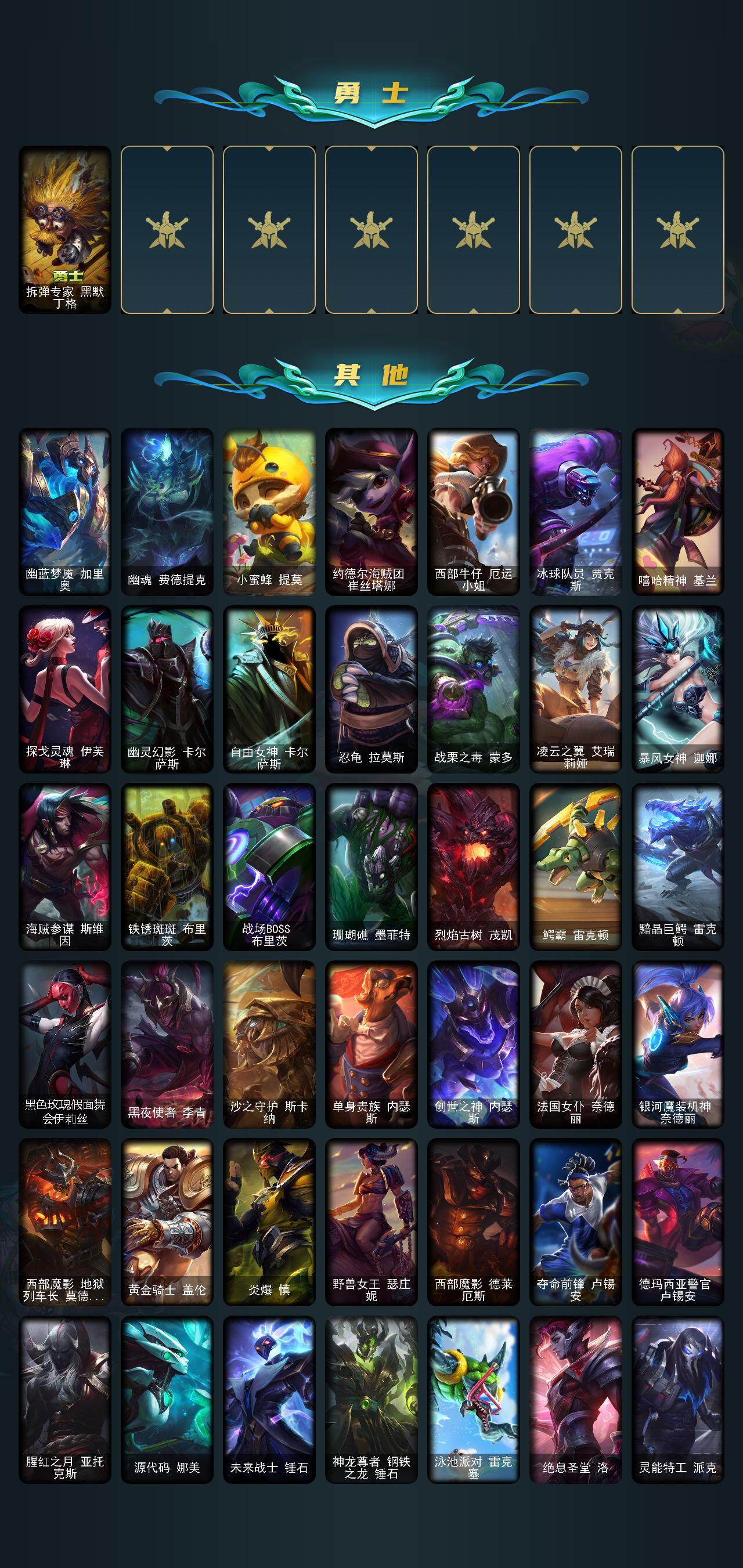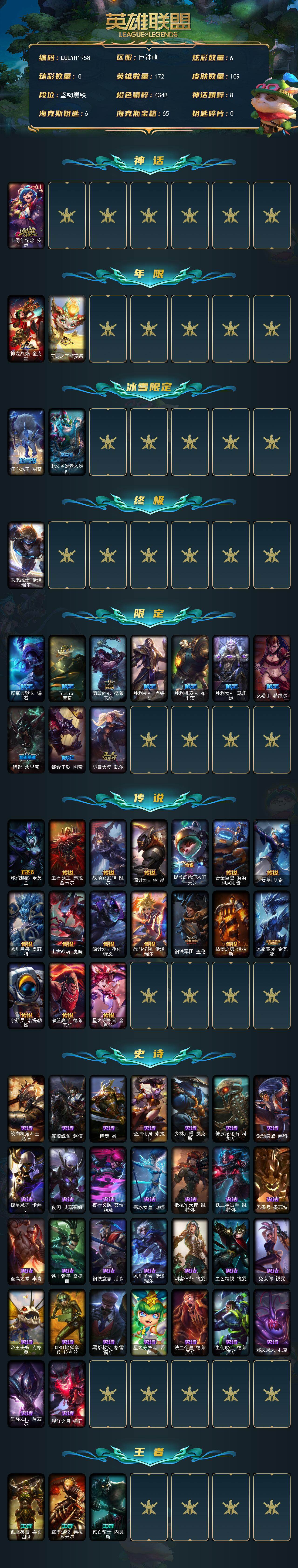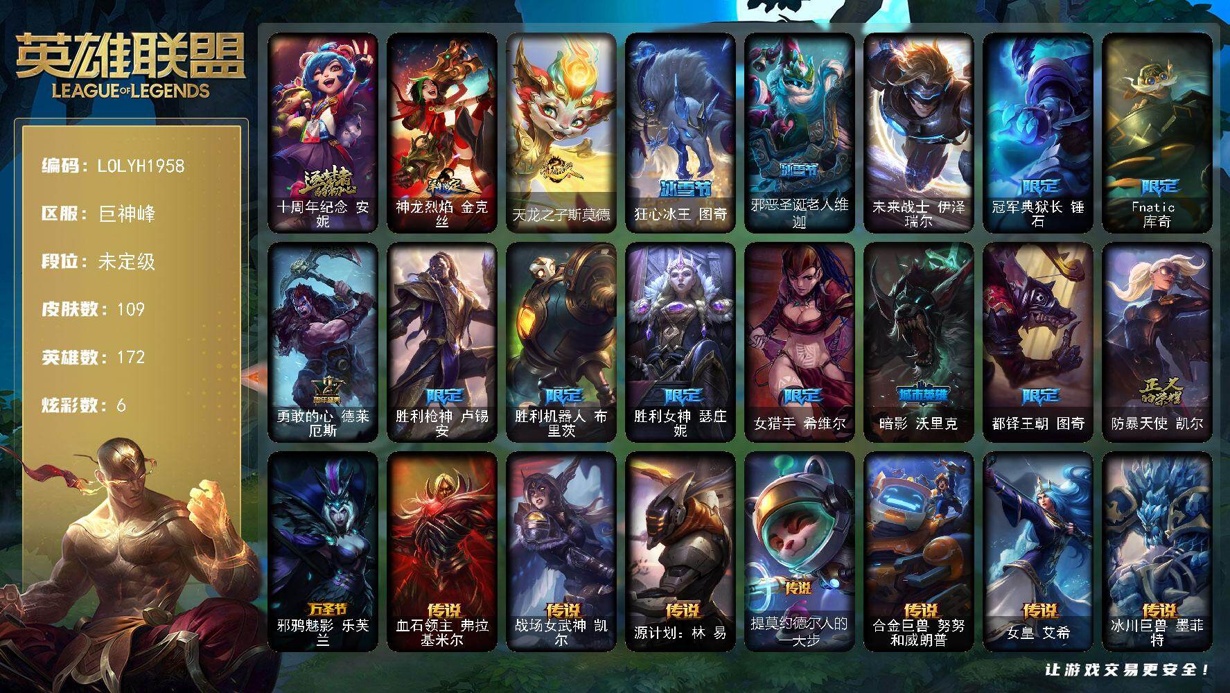 【611468】【LOLYH1958】172英雄/109皮肤/1终极/1神话/14限定/6炫彩/17传说/30史诗/未定级/十周年纪念安妮/神龙烈焰金克丝/天龙之子斯莫德/狂心冰王图奇/邪恶圣诞老人维迦/未来战士伊泽瑞尔/冠军典狱长锤石/Fnatic库奇/勇敢的心德莱厄斯/胜利枪神卢锡安/胜利机器人布里茨/胜利女神瑟庄妮/女猎手希维尔/暗影妖狐阿狸/都铎王朝图奇/防暴天使凯尔/邪鸦魅影乐芙兰/血