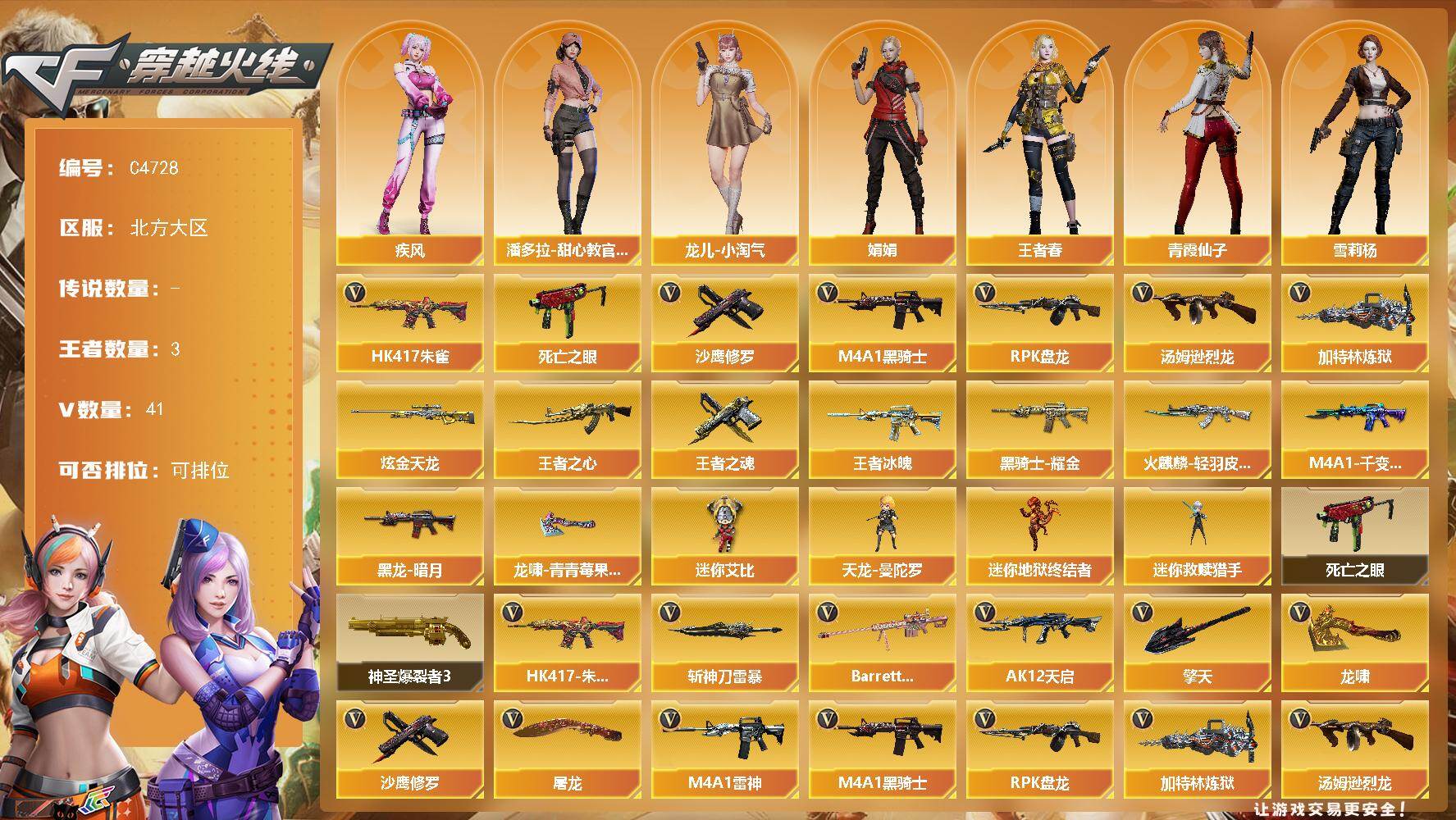 【611503】【611503】[18042497]北方大区-41V-3王者武器数-1炫金武器数【热门武器】:HK417-朱雀,死亡之眼,M4A1-黑骑士,汤