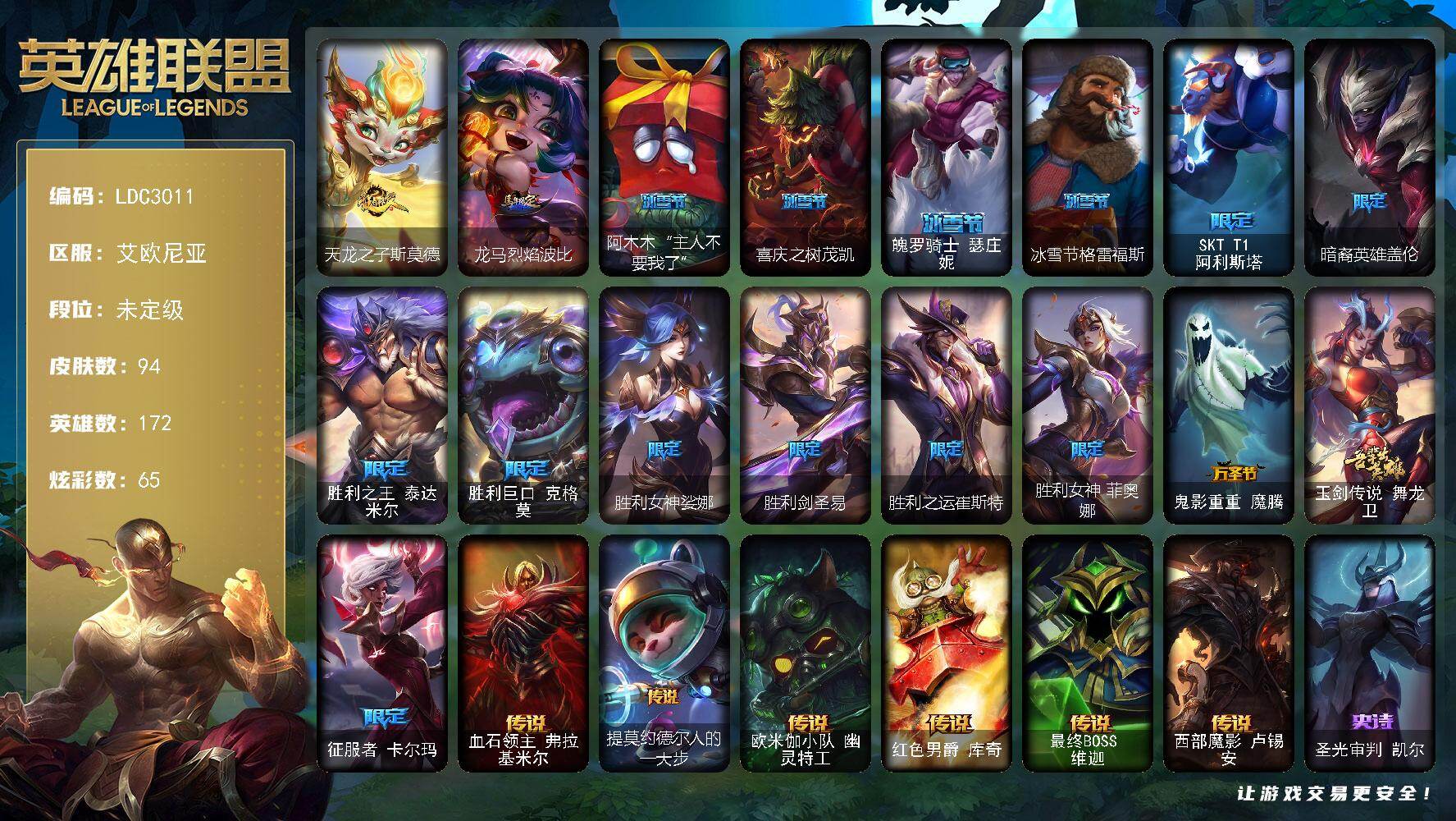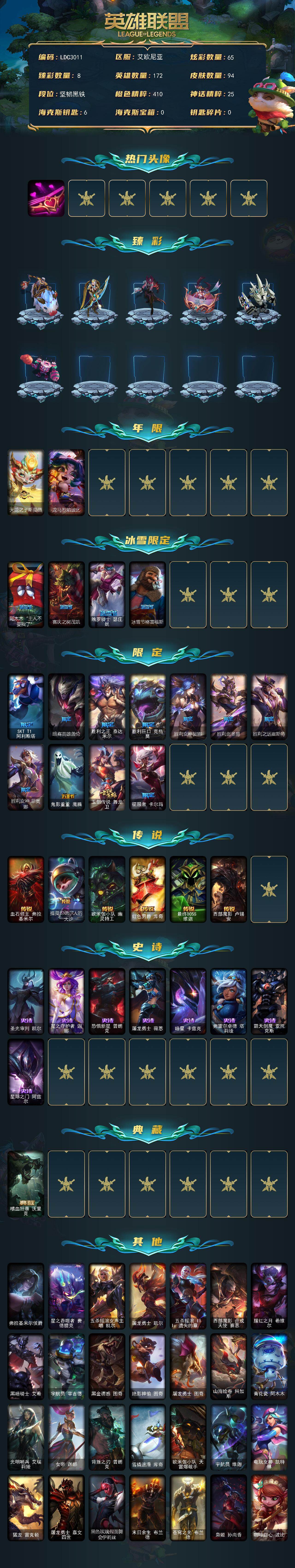 【611553】【LDC3011】172英雄/94皮肤/18限定/8臻彩/65炫彩/6传说/8史诗/未定级账号等级:358/爱情之歌/无畏骑士瑟庄妮赤子初心/冠军之箭艾希凯旋圣装/西部魔影卢锡安贝利尔之怠/玉剑传说琴仙子丁香/霸天巨兽雪崩墨菲特/可爱可爱粉红红布里茨/幽梦玫瑰伊莉丝浪漫花蕾/天龙之子斯莫德/龙马烈焰波比/阿木木:“主人不要我了”/喜庆之树茂凯/魄罗骑士瑟庄妮/冰雪节格雷福斯/SK