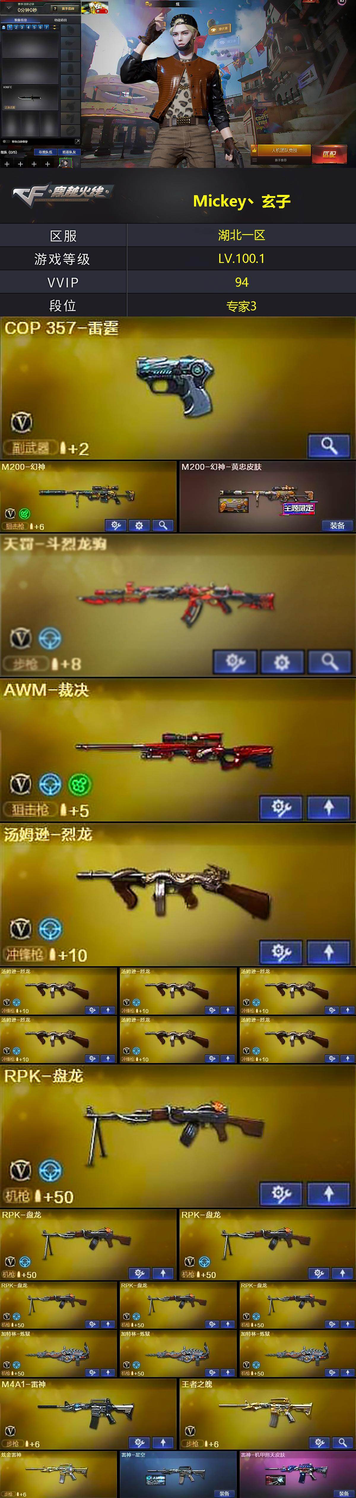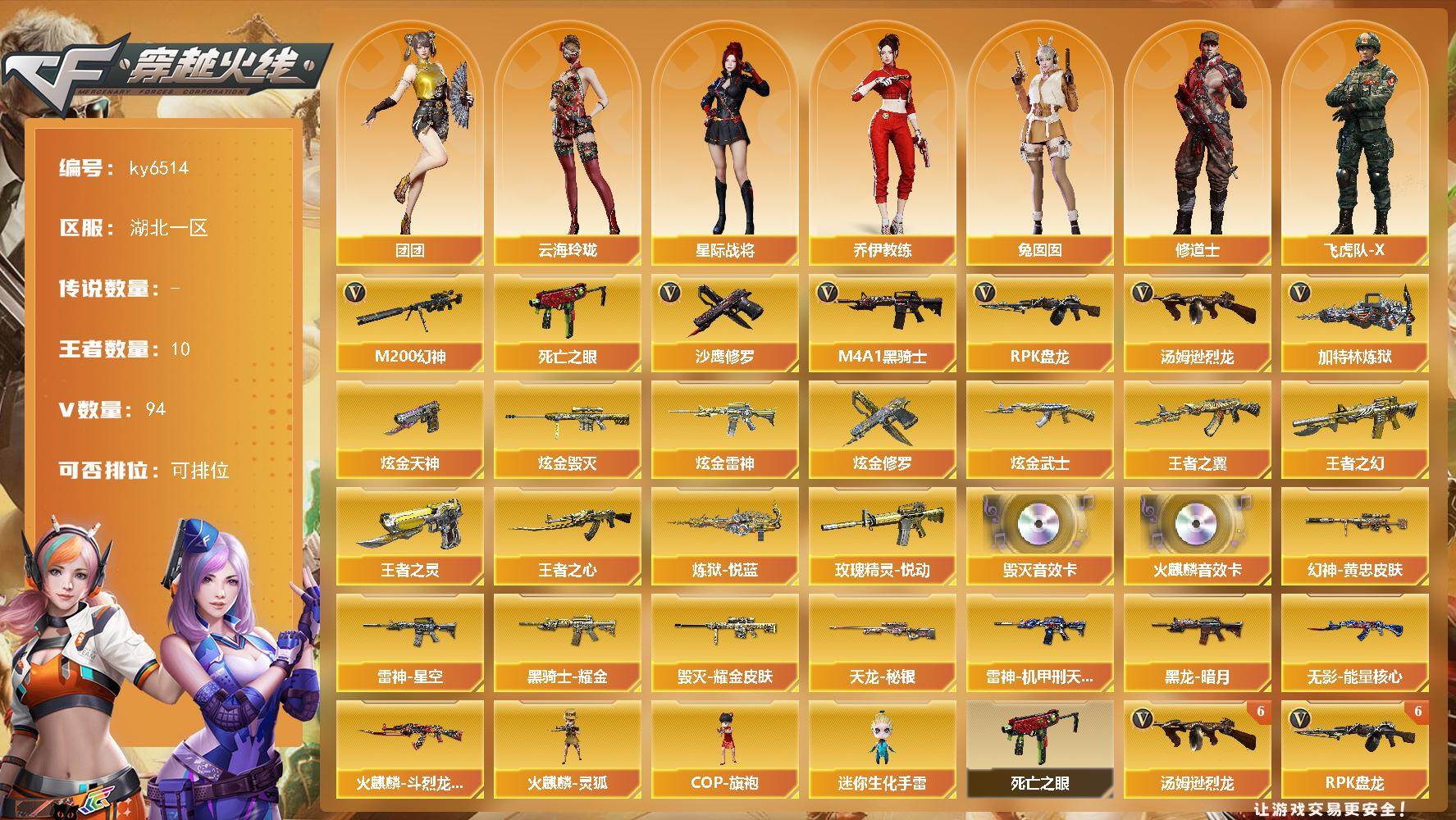 【611646】【611646】湖北一区-99V-10王者武器数-5炫金武器数【热门武器】:M200-幻神,死亡之眼,M4A1-黑骑士,汤姆逊-烈龙*7,RP