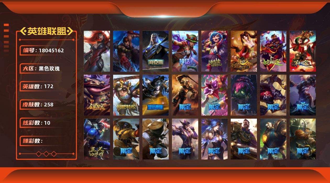 【611786】[18045162]黄金段位-172英雄-258皮肤-10炫彩-2终极-3神话-42限定-22传说-70史诗【神话皮肤】:十周年纪念安妮,十五周年纪念希维尔,海克斯科技斯维因【年限皮肤】:古琴余韵娑娜,神龙之翼库奇,神龙烈焰金克丝,纳财大帝塔姆【海克斯皮肤】:海克斯科技斯维因【冰雪限定】:圣诞精灵崔丝塔娜,圣诞狂欢努努和威朗普,胡桃夹子萨科,平安夜女神娑娜,英勇玩具兵普朗克,邪恶