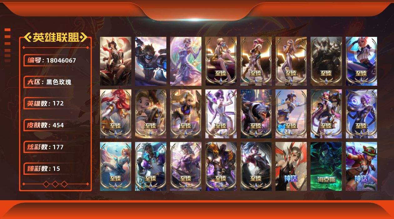 【611876】[18046067]青铜段位-172英雄-454皮肤-177炫彩-2终极-23神话-66限定-67传说-91史诗【神话皮肤】:十周年纪念安妮,殿堂传奇乐芙兰,十五周年纪念希维尔,水晶圣骑塔莉娅,摄魂使者薇恩,至臻真实伤害奇亚娜,至臻奥术师佐伊,至臻斗魂觉醒派克,至臻海之歌萨勒芬妮,至臻幻灵战斗猫金克丝,至臻花仙使者卡特琳娜,至臻KDA阿卡丽,至臻KDAALLOUT卡莎,至臻KDA