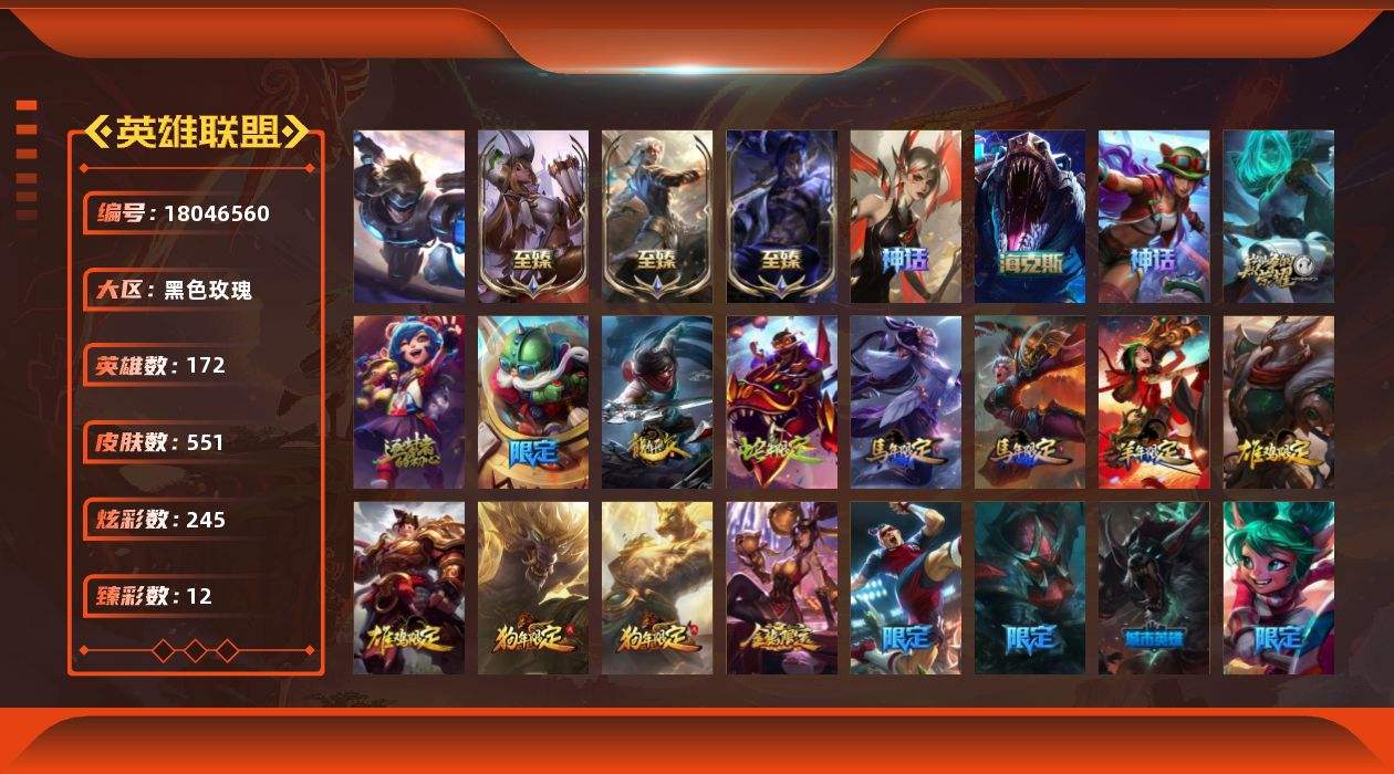 【611913】[18046560]【店主推荐捡漏号】青铜段位-172英雄-551皮肤-245炫彩-1终极-9神话-87限定-52传说-143史诗【珍稀头像】:至爱的鹿头像【热门头像】:爱意绵绵头像【至臻皮肤】:至臻魅惑女巫厄运小姐,至臻黑夜使者凯隐,至臻墨之影武者亚索【臻彩皮肤】:天龙之子卡莎飞龙乘云,无畏骑士瑟庄妮赤子初心,墨之影武者亚索金墨耀影,冠军之血希瓦娜凯旋圣装,雾雨之刃锐雯,弹幕天