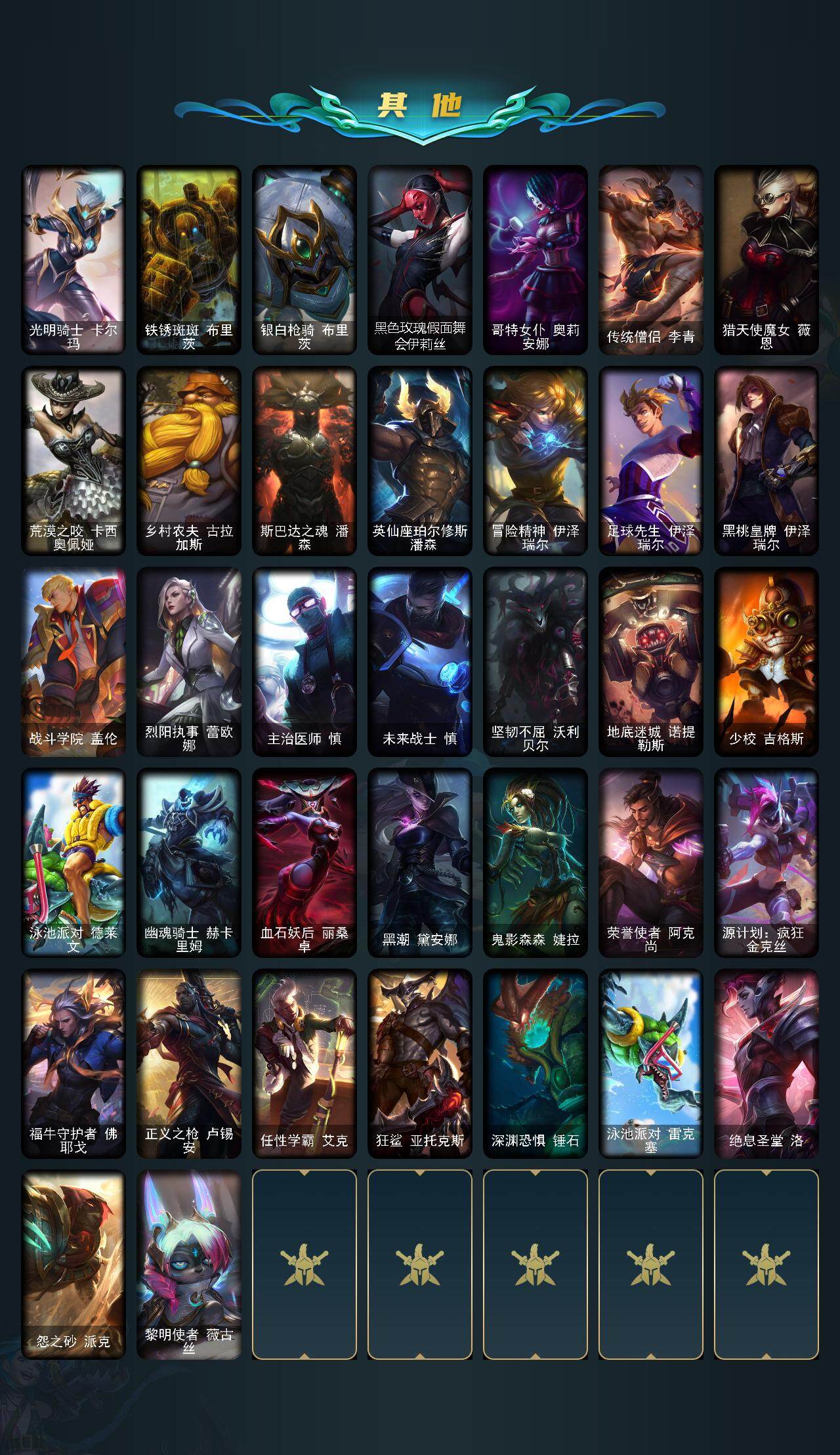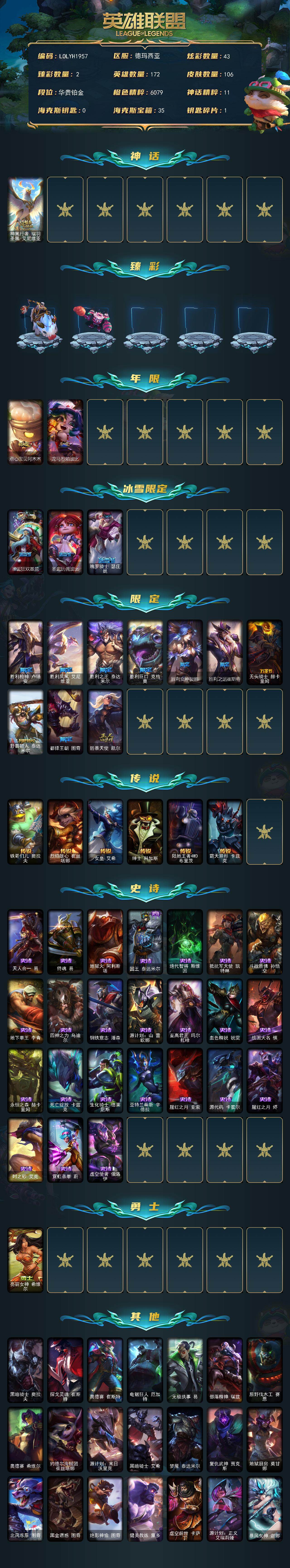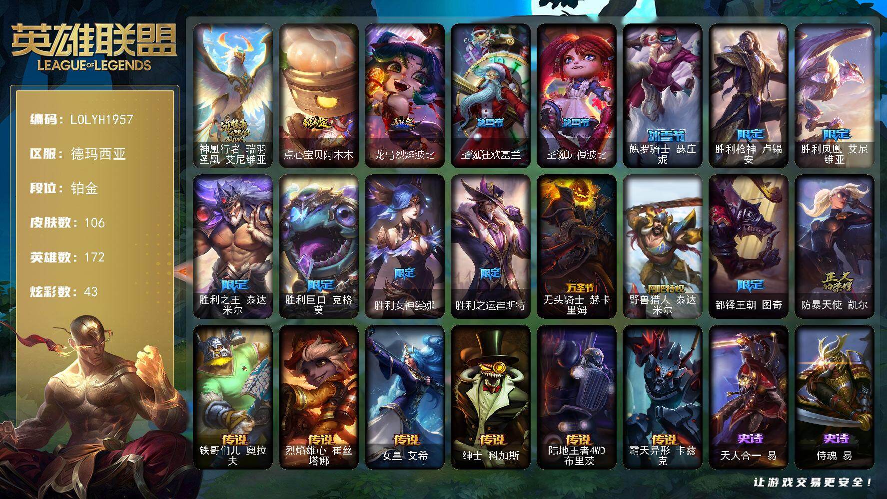 【618452】【LOLYH1957】172英雄/106皮肤/1神话/16限定/2臻彩/43炫彩/6传说/24史诗/铂金/神凰行者瑞羽凤凰艾尼维亚/无畏骑士瑟庄妮赤子初心/可爱可爱粉红红布里茨/点心宝贝阿木木/龙马烈焰波比/圣诞狂欢基兰/圣诞玩偶波比/魄罗骑士瑟庄妮/胜利枪神卢锡安/胜利凤凰艾尼维亚/胜利之王泰达米尔/胜利巨口克格莫/胜利女神娑娜/胜利之运崔斯特/无头骑士赫卡里姆/野兽猎人泰达米