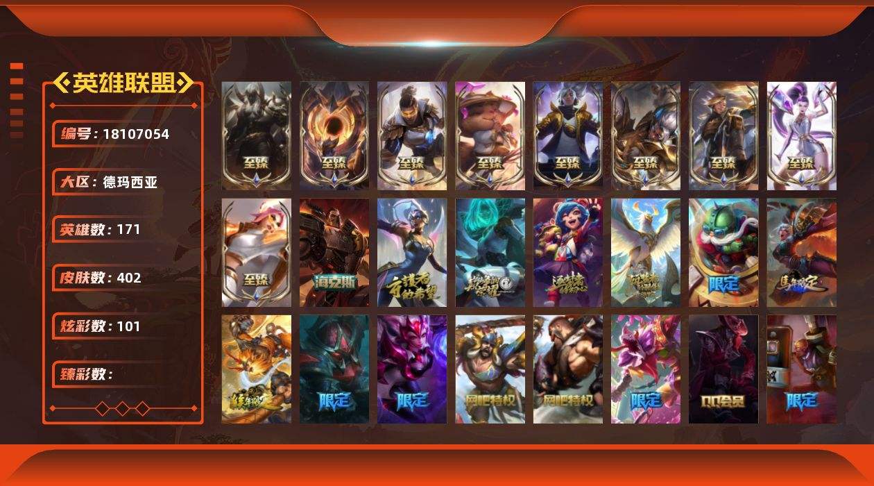【620652】[18107054]14神话 54限定 37传说 106史诗 402皮肤 101炫彩 171英雄 可二次 可修改实名 【至臻】至臻 腥红之月 亚托克斯,至臻 暗星 墨菲特,至臻 未来战士 卢锡安,至臻 灵魂莲华 提莫,至臻 真实伤害 亚索,至臻 神龙尊者 炎龙瑟提,至臻 灵能特工 伊泽瑞尔,至臻 K/DA ALL OUT卡莎,至臻 福牛守护者 菲奥娜【海克斯】恐惧新星 德莱厄斯【