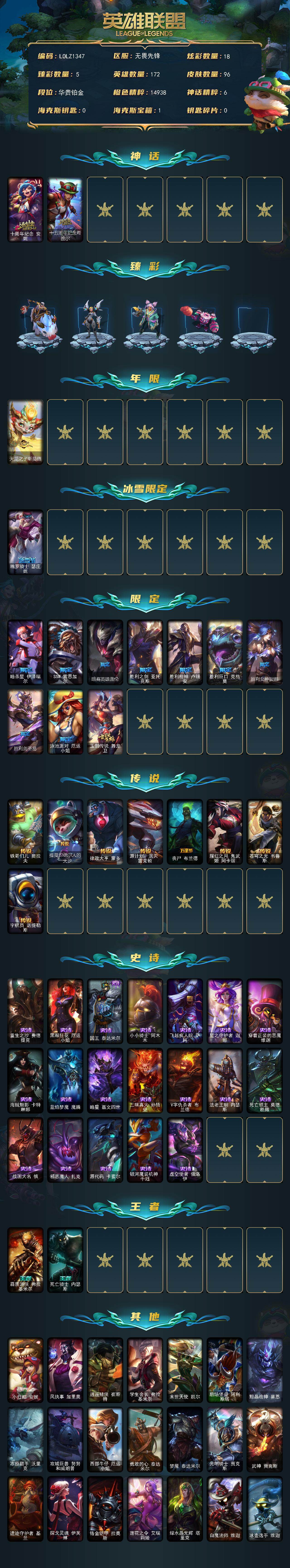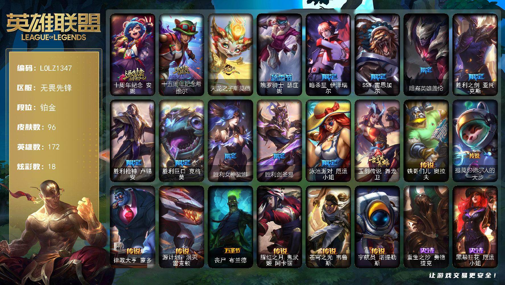 【627703】【LOLZ1347】172英雄/96皮肤/2神话/12限定/5臻彩/18炫彩/8传说/19史诗/铂金/十周年纪念安妮/十五周年纪念希维尔/无畏骑士瑟庄妮赤子初心/弹幕天使卡莎炽天使公正/玉剑传说神机花火青竹/可爱可爱粉红红布里茨/天龙之子斯莫德/魄罗骑士瑟庄妮/暗杀星伊泽瑞尔/SSW雷恩加尔/暗裔英雄盖伦/胜利之剑亚托克斯/胜利枪神卢锡安/胜利巨口克格莫/胜利女神娑娜/胜利剑圣易
