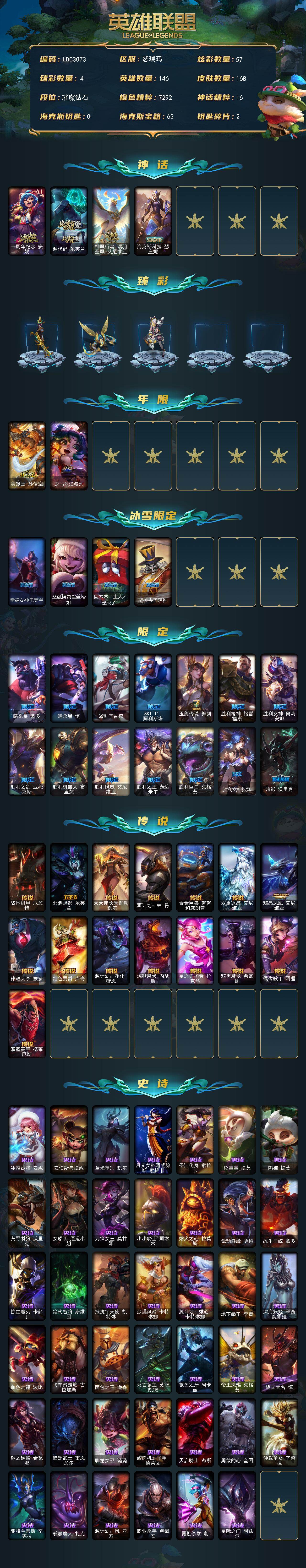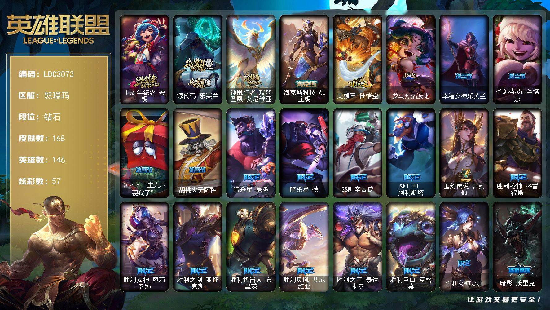 【628822】【LDC3073】146英雄/168皮肤/4神话/21限定/4臻彩/57炫彩/15传说/41史诗/钻石/十周年纪念安妮/源代码乐芙兰/神凰行者瑞羽凤凰艾尼维亚/海克斯科技瑟庄妮/玉净夜叉凯特琳炫金神机/冠军掠夺者卡兹克凯旋圣装/咖啡甜心金克丝核桃巴菲/魔女阿卡丽虚荣/美猴王孙悟空/龙马烈焰波比/幸福女神乐芙兰/圣诞精灵崔丝塔娜/阿木木:“主人不要我了”/胡桃夹子萨科/暗杀星蒙多/